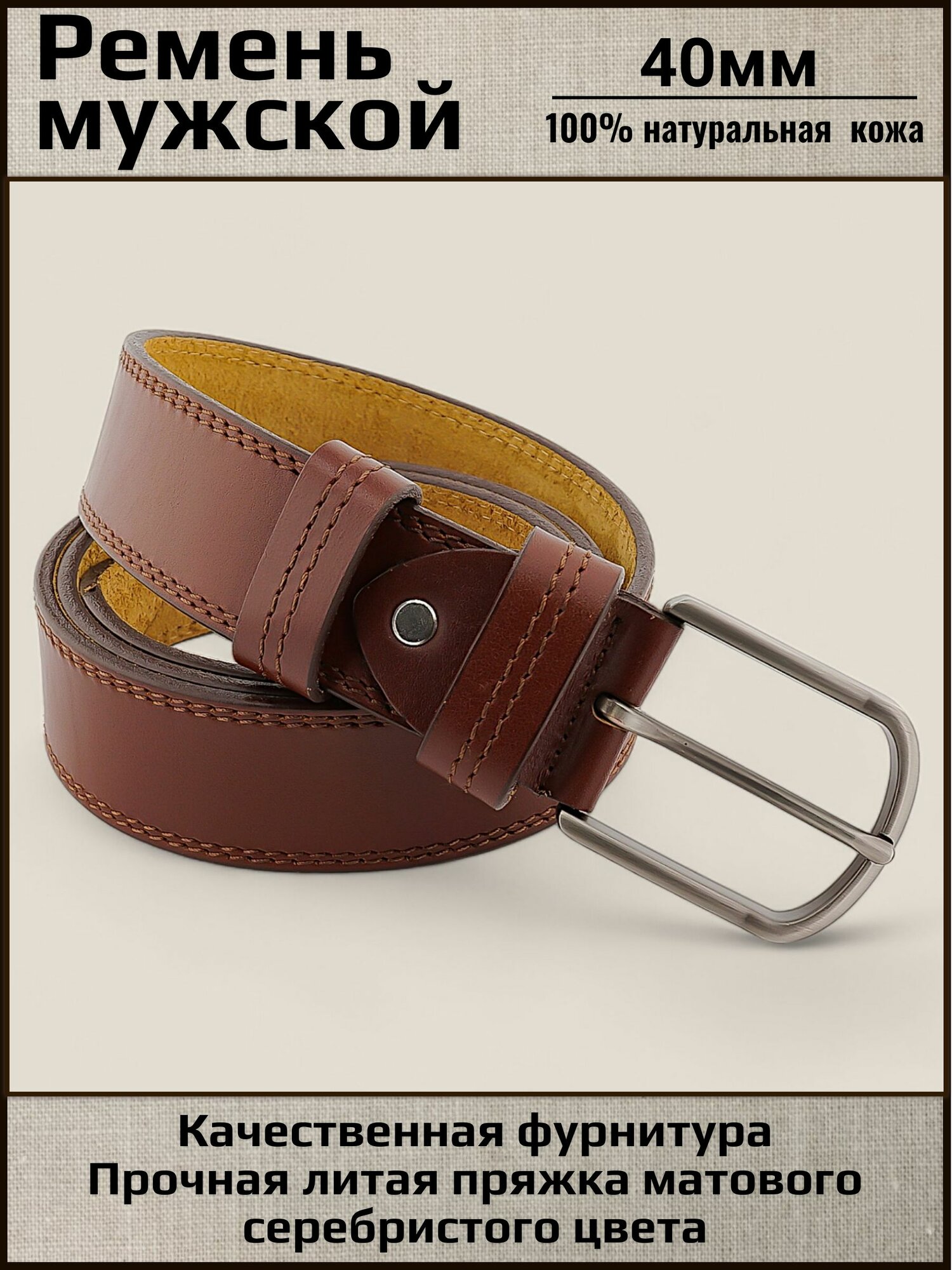 Ремень мужской кожаный Aksy Belt коричневый, 40мм, 2 строчка, Италия, матовое серебро, 130 см 1 869 ₽