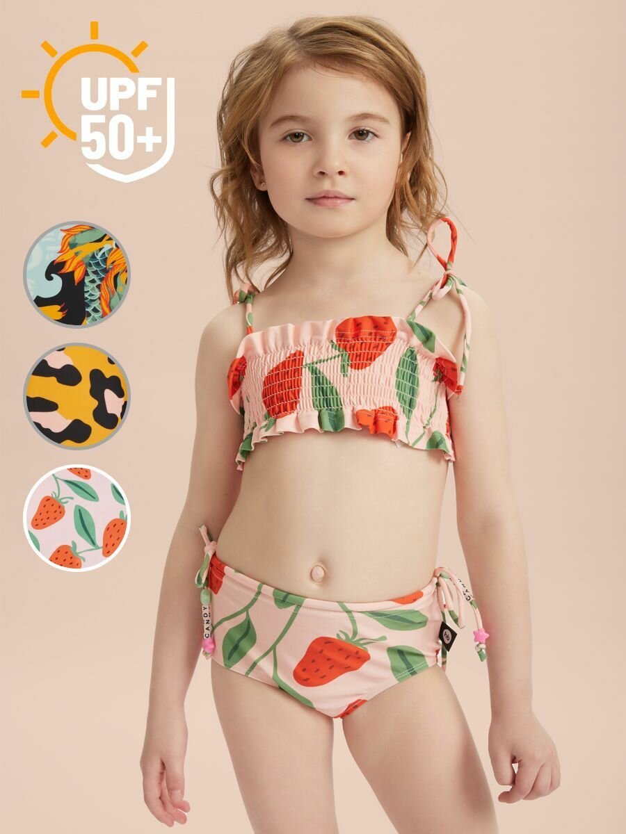 10 цен на 50666, Купальник раздельный для девочек Happy Baby, купальник детский, двухпредметный: лиф купальный, верх и плавки с защитой от солнца UPF 50+, солнцезащитный, розовый с клубничками, рост 104-110