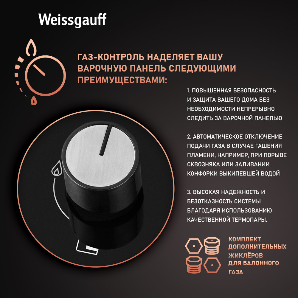 Варочная панель Weissgauff HGG 451 BGV WOK-конфорка, 3 года гарантии, автоматический электроподжиг, Рукоятки Hi-Tech, газ-контроль информация: