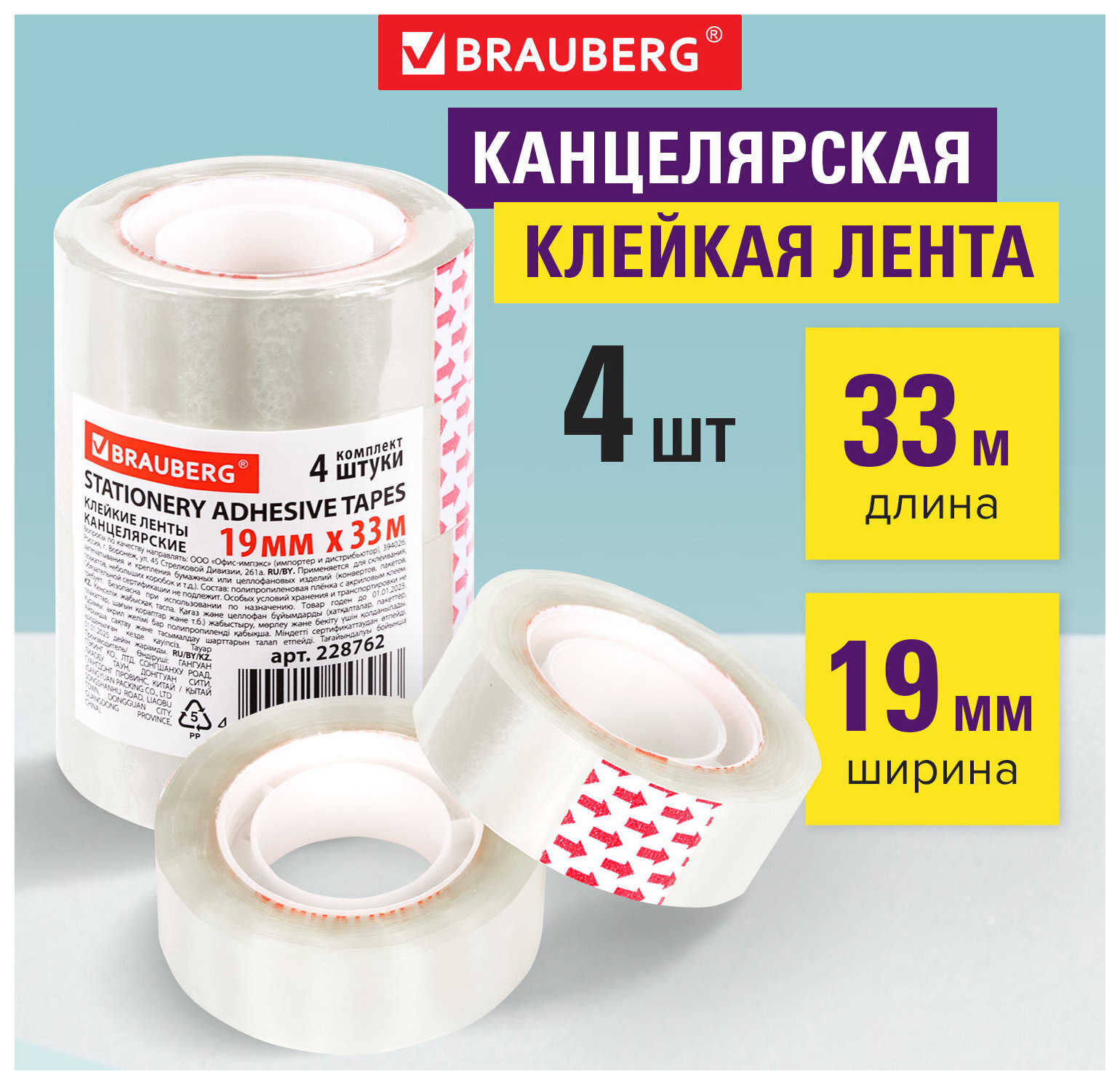 10 цен на Клейкие ленты 19мм х 33м канцелярские BRAUBERG, комплект 4шт., прозрачные, гарантиров. длина, 228762