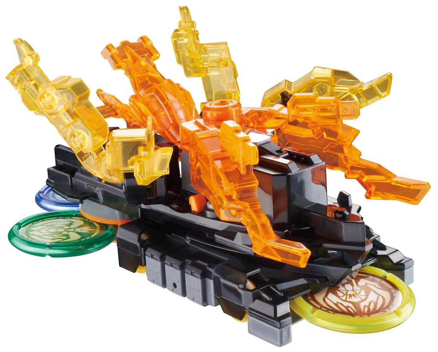 | Дополнительная информация | машинка разгоняется, захватывает один диск, прокручивается вокруг своей оси, захватывая еще три диска, делает кувырок и самостоятельно трансформируется прямо в воздухе |
