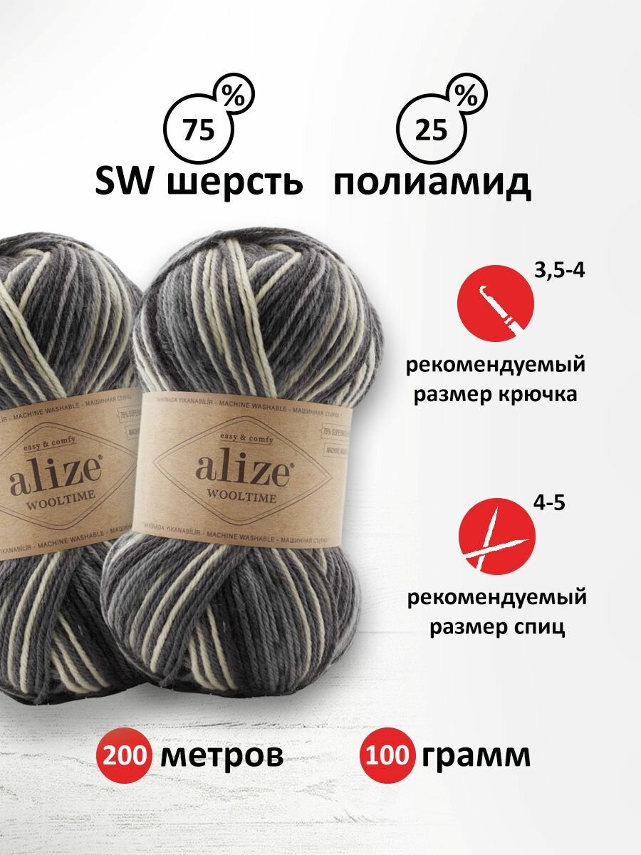 Пряжа Wooltime, Alize, принт - 11018, 75% SW шерсть, 25% полиамид, 5 мотков, 100 г., 200 м. 2 354 ₽