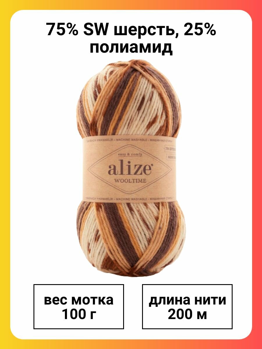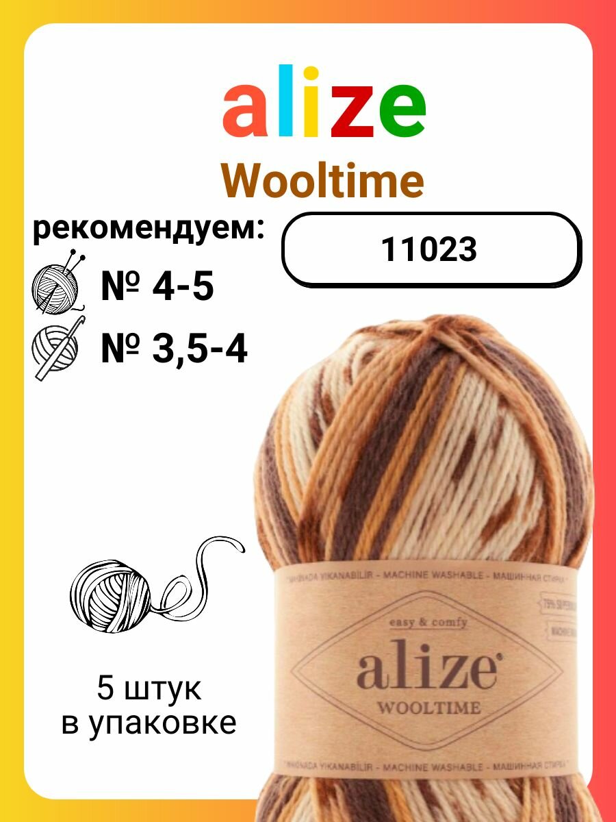 Пряжа Wooltime, Alize, бел/беж/корич - 11023, 75% SW шерсть, 25% полиамид, 5 мотков, 100 г., 200 м. информация: