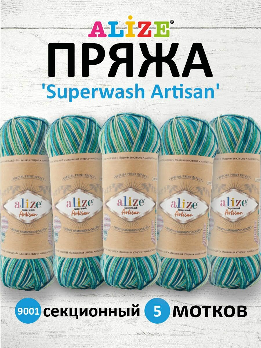Пряжа SUPERWASH ARTISAN ALIZE, зел. бирюза принт - 9001, 75% SW шерсть, 25% полиамид, 5 мотков, 100 г, 420 м.