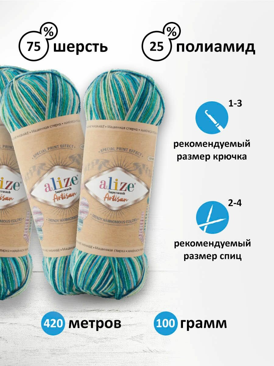 Пряжа Alize Superwash Artisan (Супервош Артисан) - 3 мотка, Плющ (873), 25% полиамид, 75% шерсть супервош, 420м/100г 1 040 ₽
