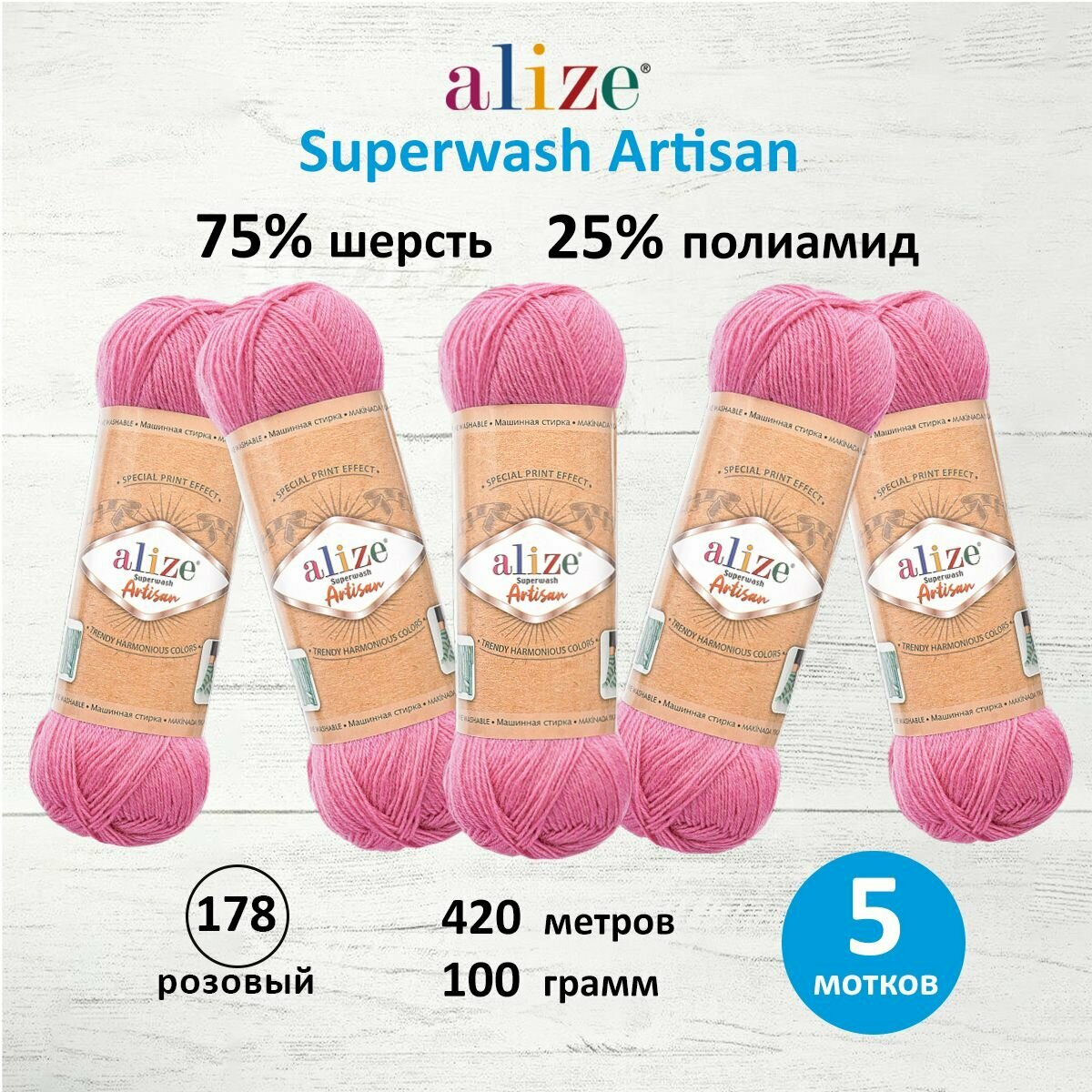 Пряжа Alize Superwash Artisan (Ализе Супервош Артизан) - 5 мотков, Розовый (178), 75% шерсть супервош, 25% полиамид, 420м/100г