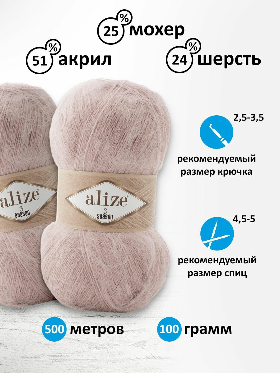 Пряжа Alize 3 Season светло-розовый (271), 25%мохер/24%шерсть/51%акрил, 500м, 100г, 5шт 2 072 ₽
