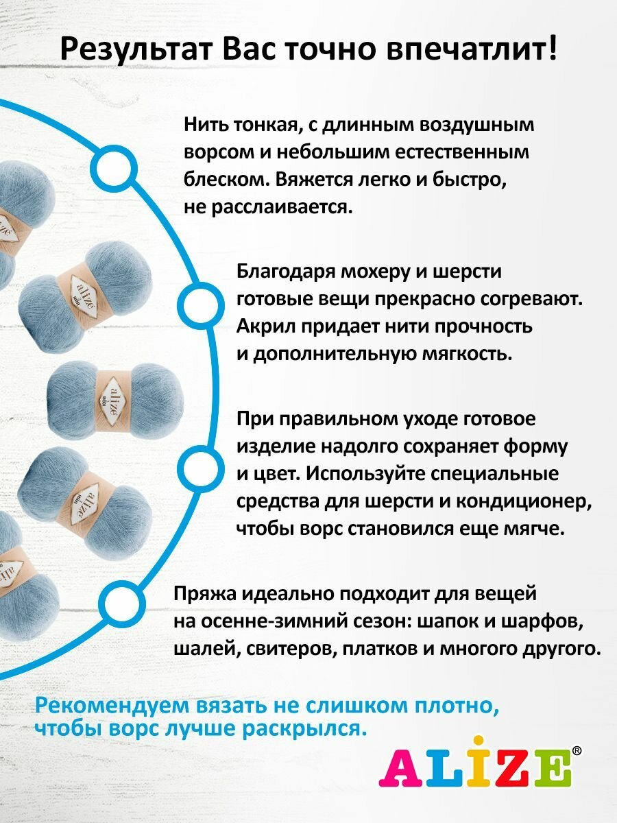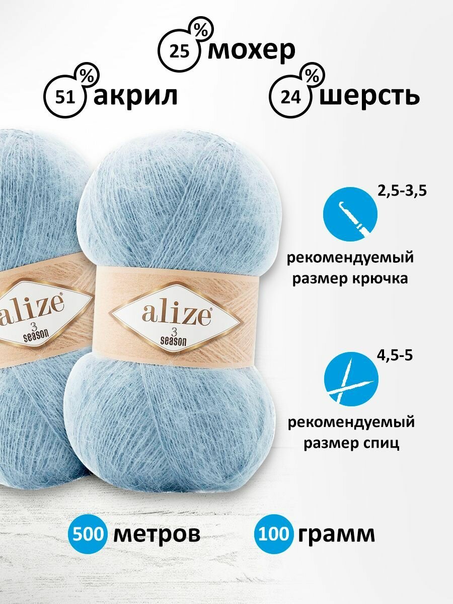 Пряжа для вязания ALIZE '3 SEASON', 100г, 500м (25% мохер, 24% шерсть, 51% акрил) (40 голубой), 5 мотков 2 203 ₽