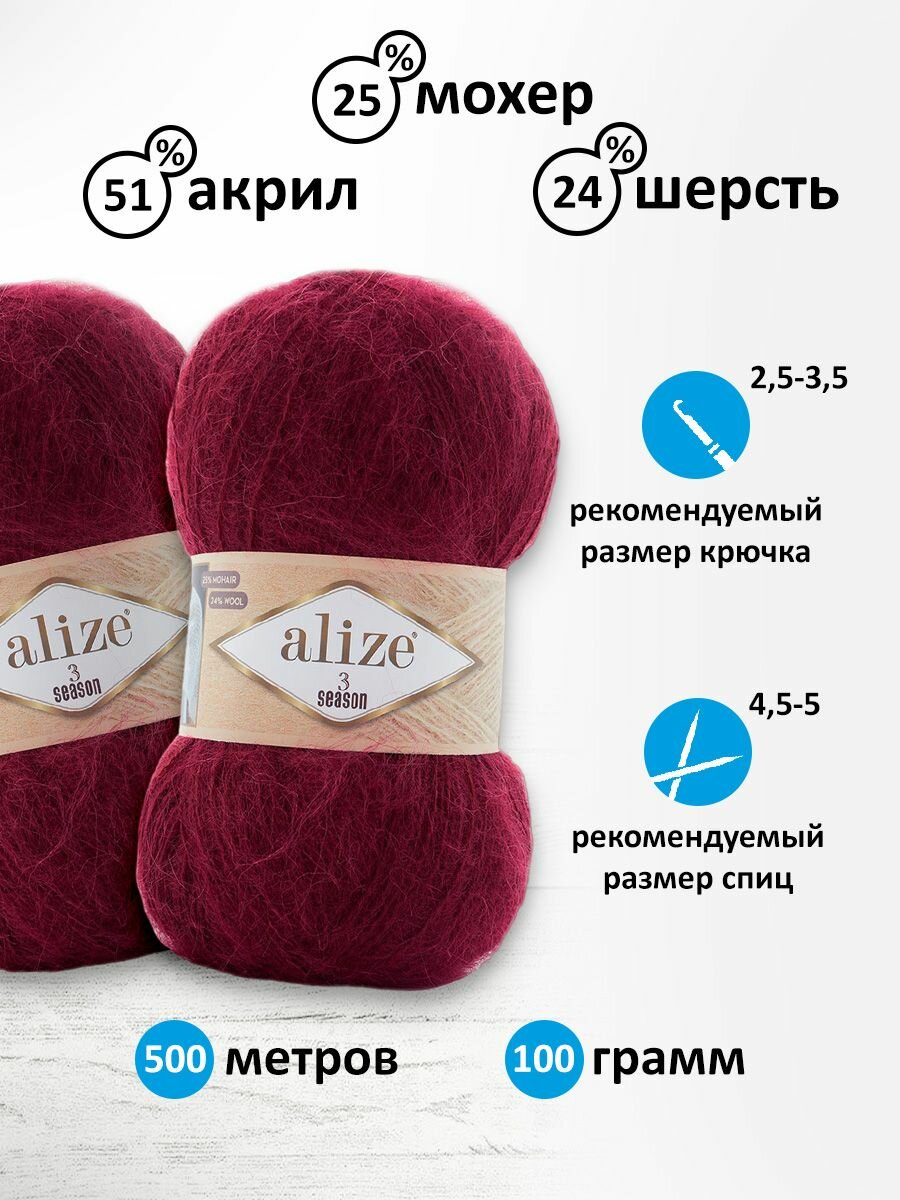 Пряжа для вязания ALIZE '3 SEASON' 100г 500м (25% мохер, 24% шерсть, 51% акрил) (57 бордо), 5 мотков информация: