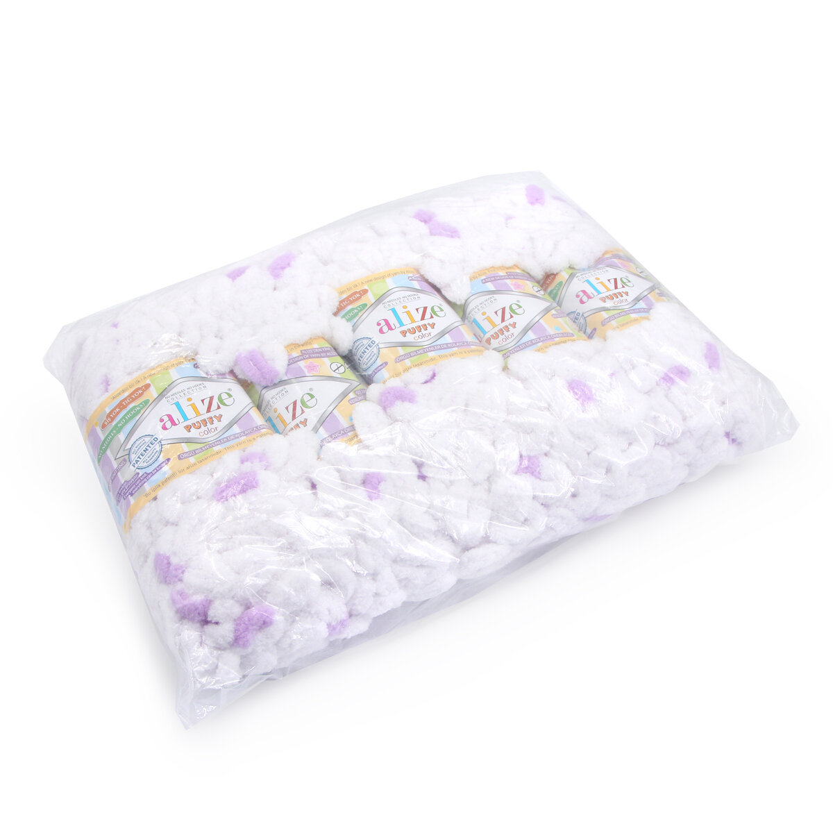 10 цен на Пряжа Alize Puffy color белый-фиолетовый (6470), 100%микрополиэстер, 9м, 100г, 5шт