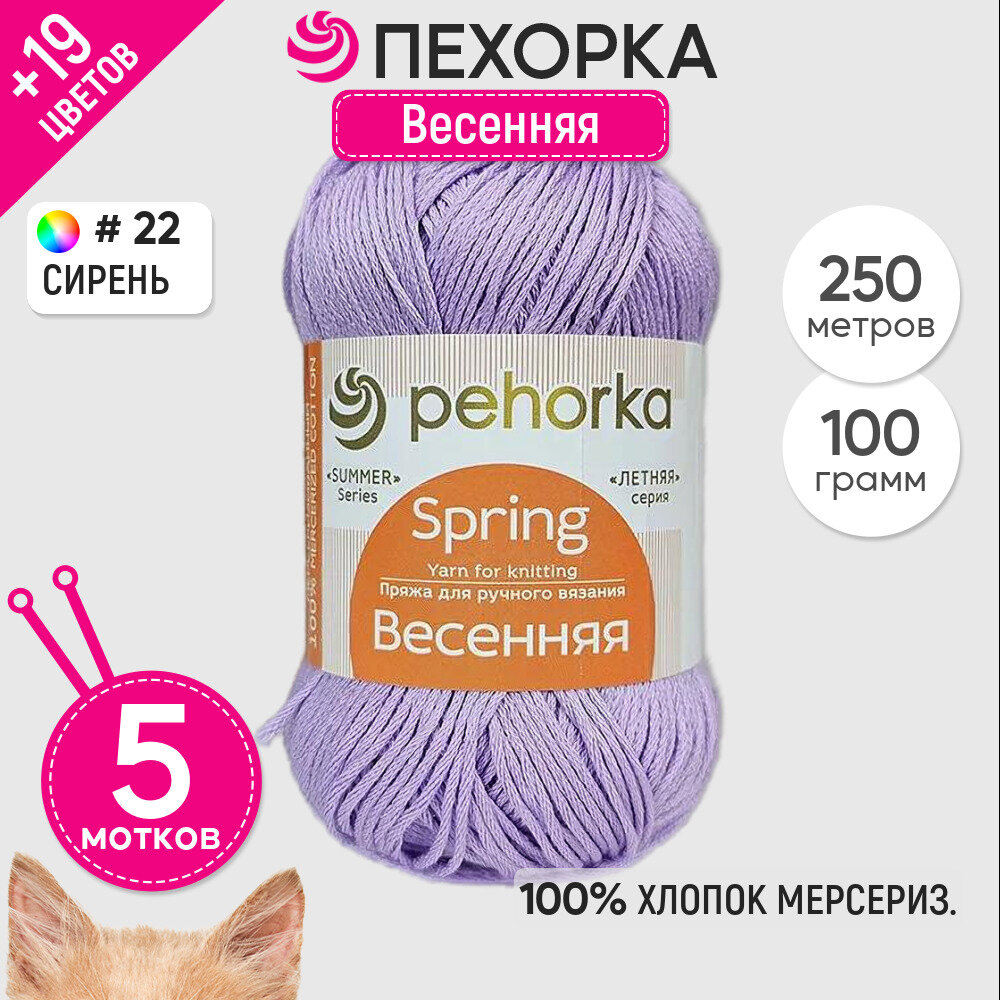 Пряжа для вязания Пехорка 'Весенняя', 100г, 250м (100% мерсеризованный хлопок) (22 сирень), 5 мотков информация: