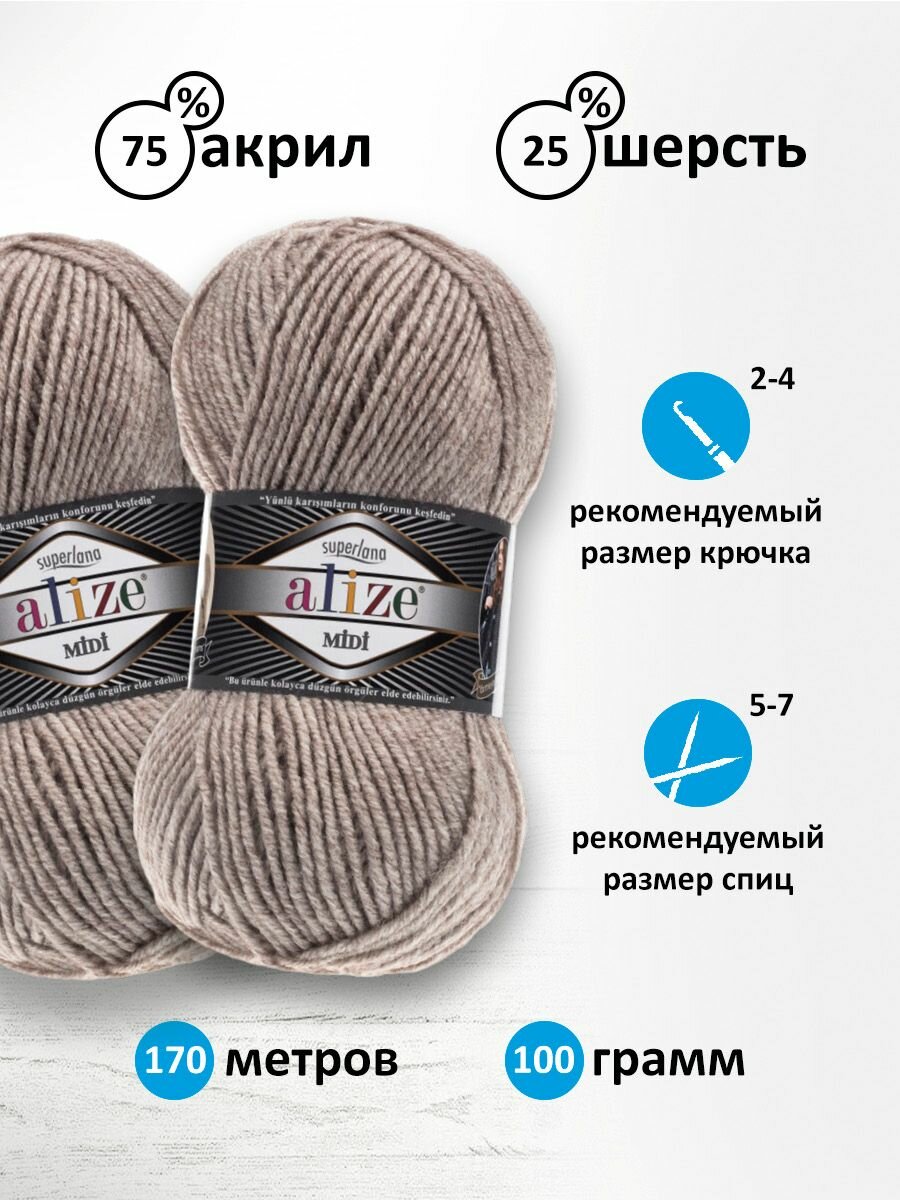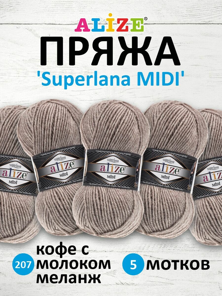 Пряжа для вязания ALIZE 'Superlana MIDI', 100г, 170м (25% шерсть, 75% акрил) (207 кофе с молоком меланж), 5 мотков информация: