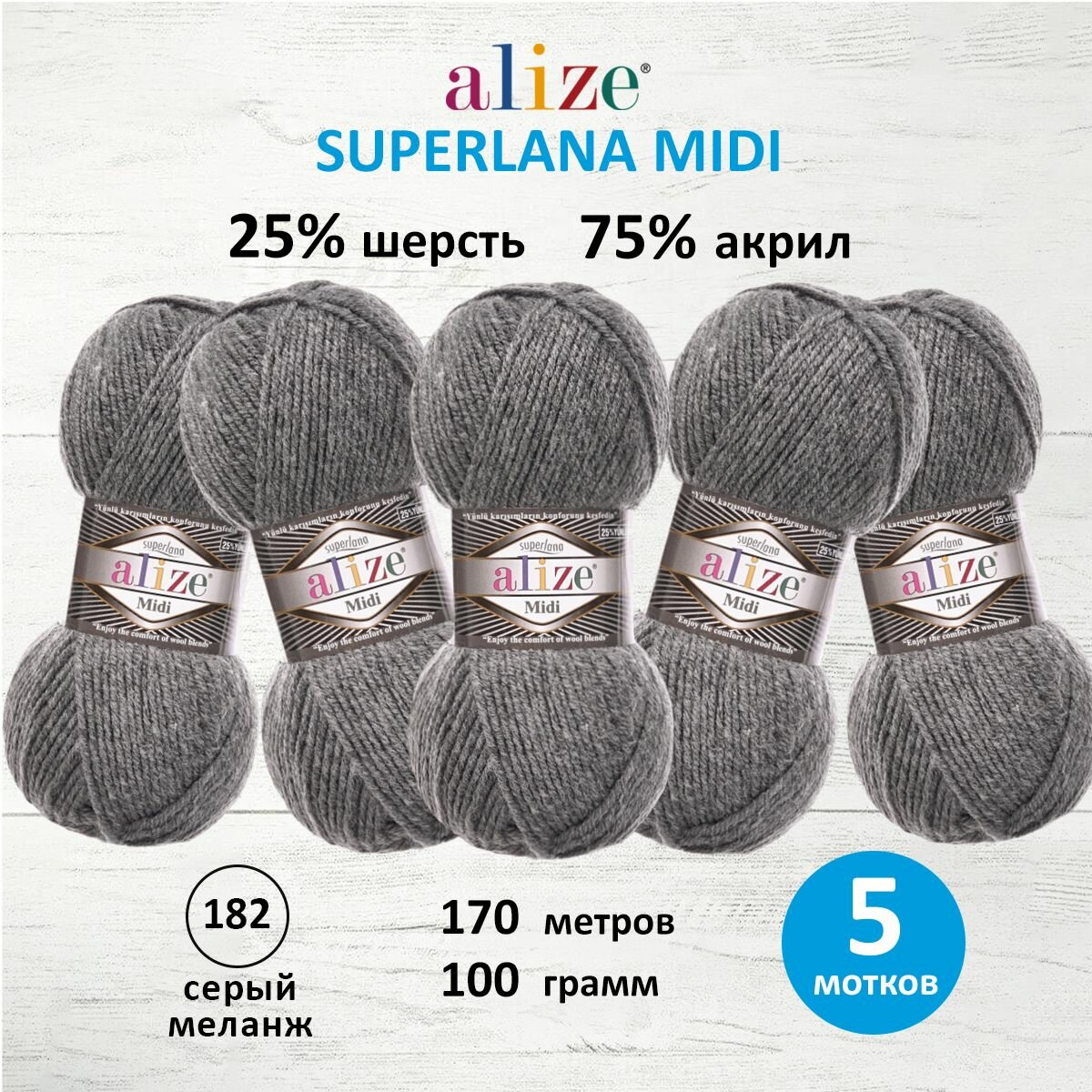 Пряжа ALIZE SUPERLANA MIDI, серый меланж - 182, 25% шерсть, 75% акрил, 5 мотков, 100 г, 170 м.