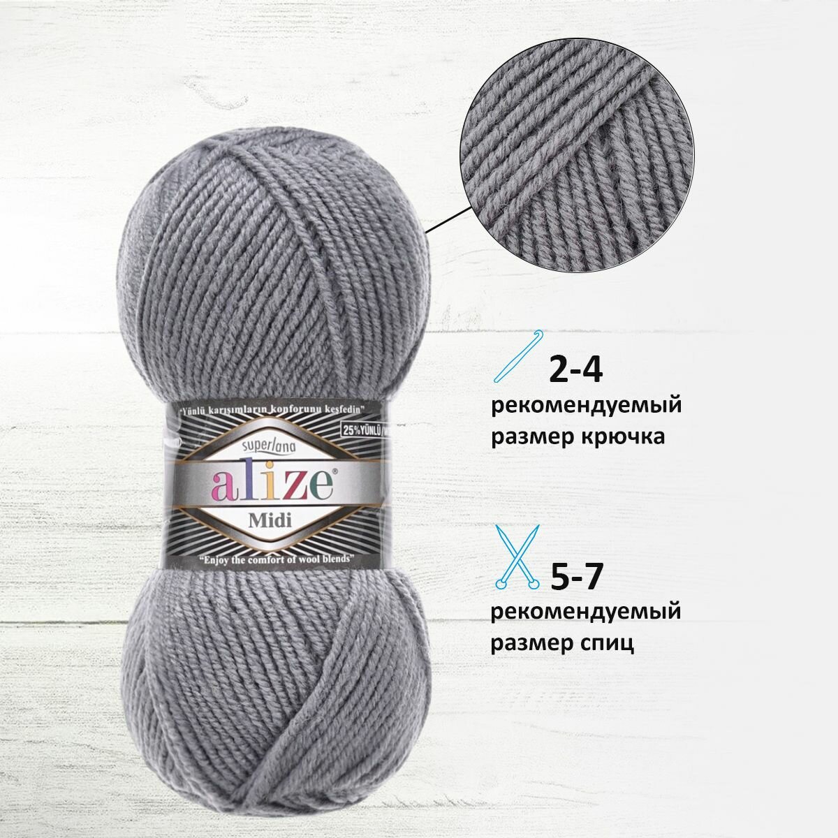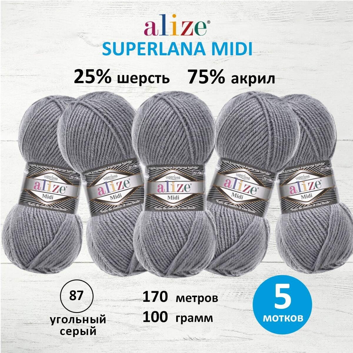 10 цен на Пряжа Alize Superlana Midi угольный серый (87), 25%шерсть/75%акрил, 170м, 100г, 5шт