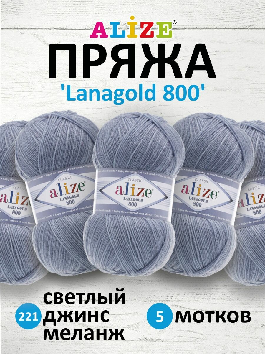 Пряжа для вязания ALIZE 'Lanagold 800', 100г, 730м (49% шерсть, 51% акрил) (221 светллый джинс меланж), 5 мотков информация: