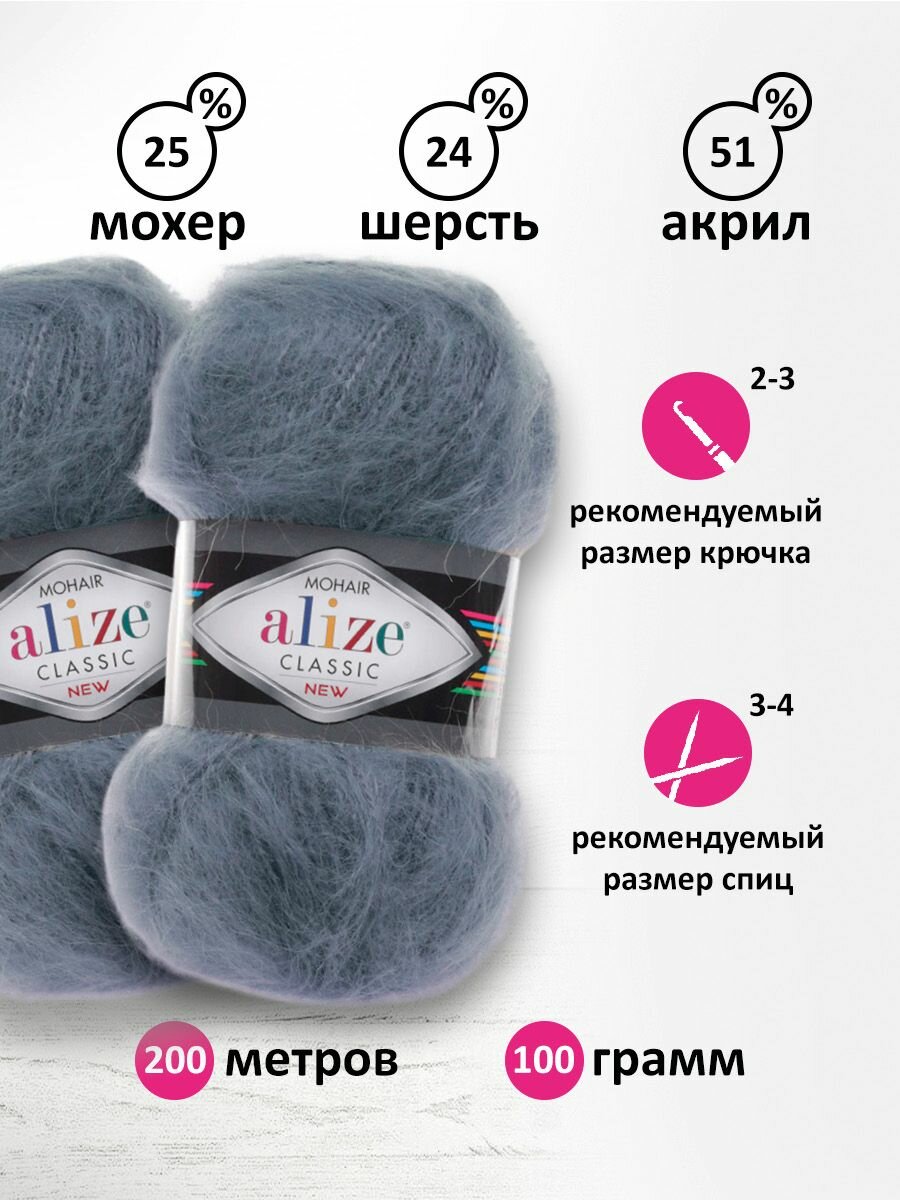 Пряжа Alize Mohair Classic New (Мохер Классик Нью) - 5 мотков Цвет: 40 голубой 25% мохер, 24% шерсть, 51% акрил 100г 200м