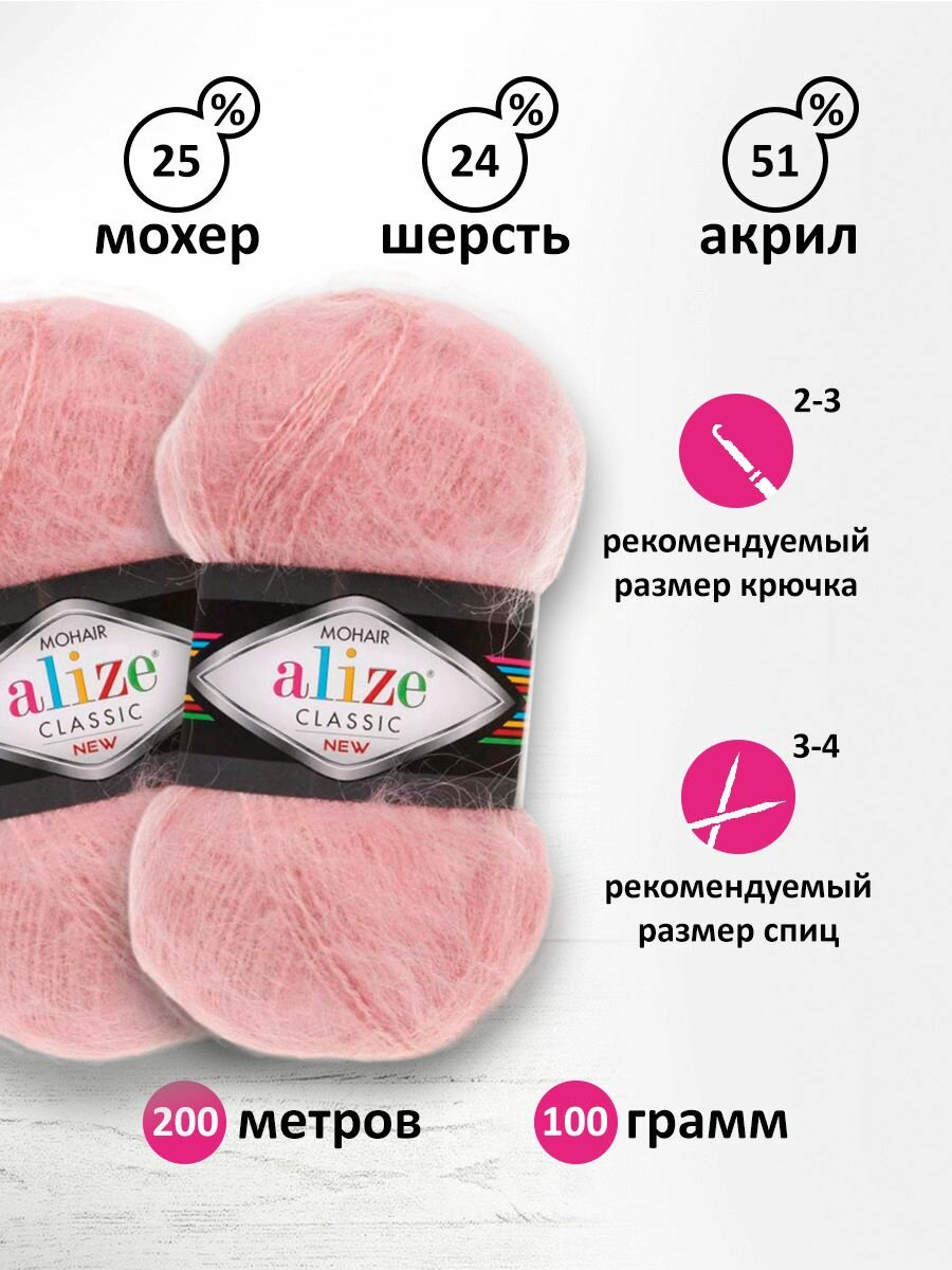 10 цен на Пряжа Alize Mohair Classic пудра (161), 24%шерсть/25%мохер/51%акрил, 200м, 100г, 5шт