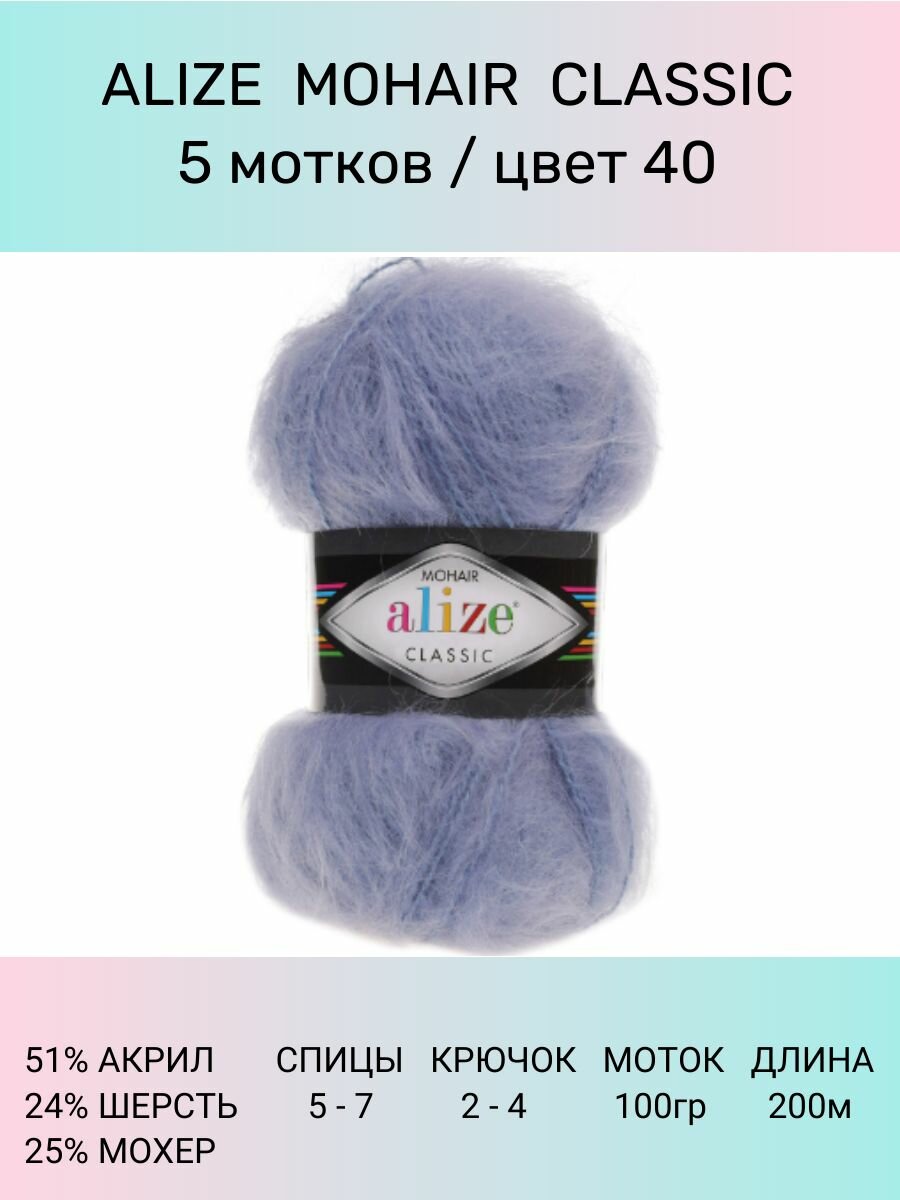 Пряжа Alize Mohair Classic голубой (40), 24%шерсть/25%мохер/51%акрил, 200м, 100г, 5шт информация: