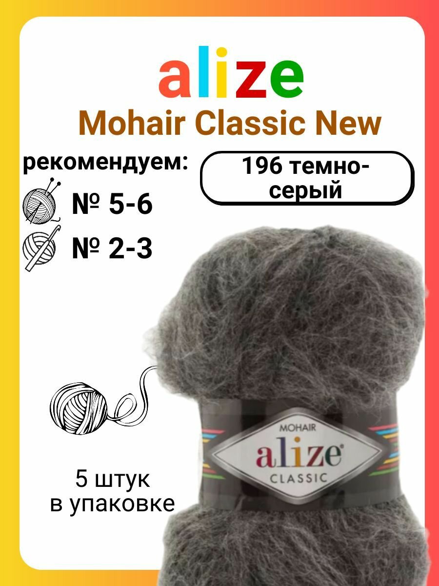 10 цен на Пряжа для вязания Alize Mohair Classic New (196) темно-серый, 100 г, 200 м, 5 штук