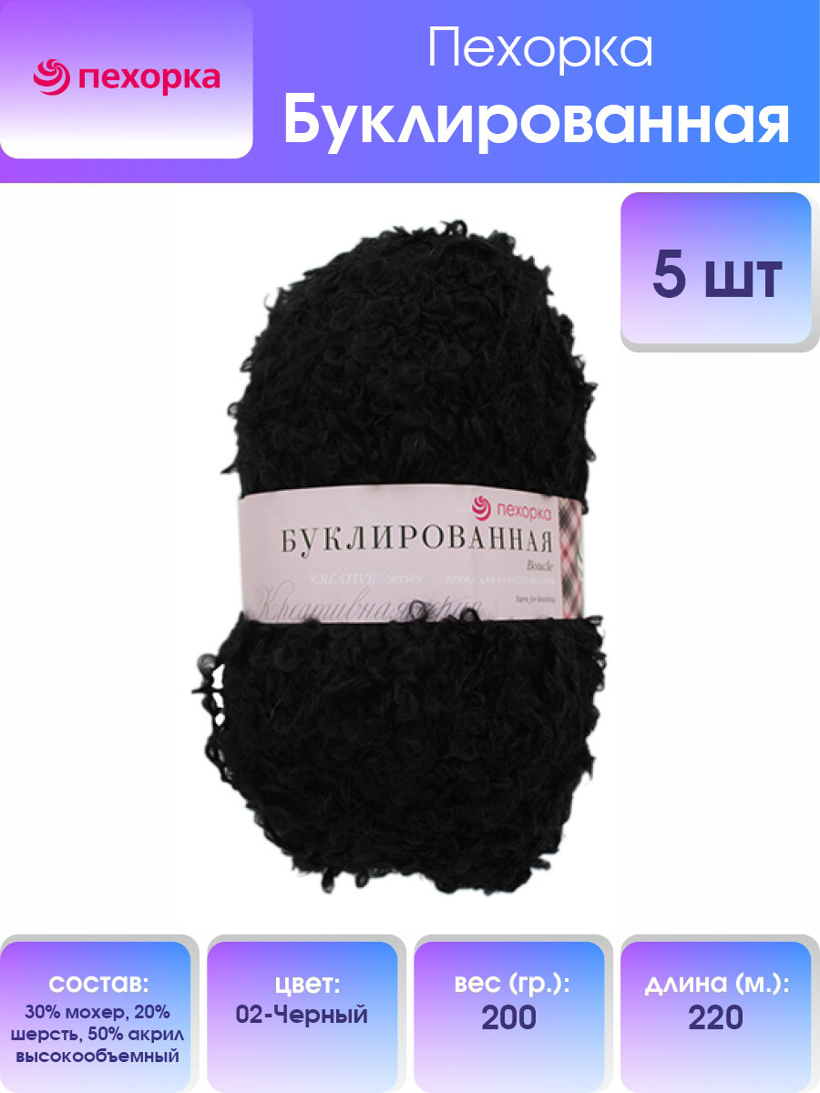 Пряжа Пехорка Буклированная черный (002), 30%мохер/20%шерсть/50%акрил, 220м, 200г, 5шт информация: