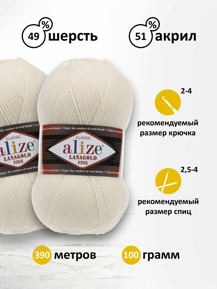 10 цен на Пряжа Alize Lanagold Fine молочный (62), 51%акрил/49%шерсть, 390м, 100г, 5шт