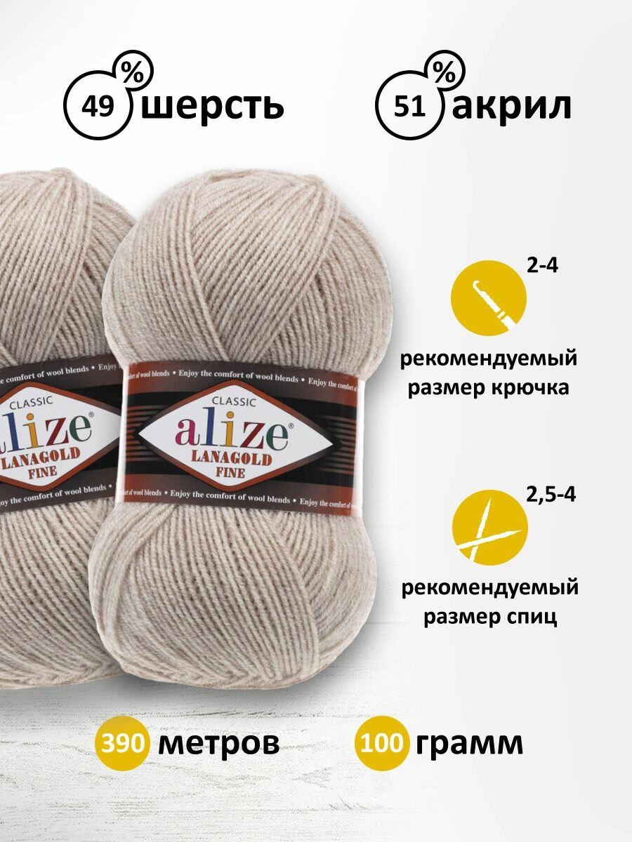 Пряжа для вязания ALIZE LANAGOLD FINE: 5 (бежевый), 5 шт 390 м 100 г, 49% шерсть 51% акрил