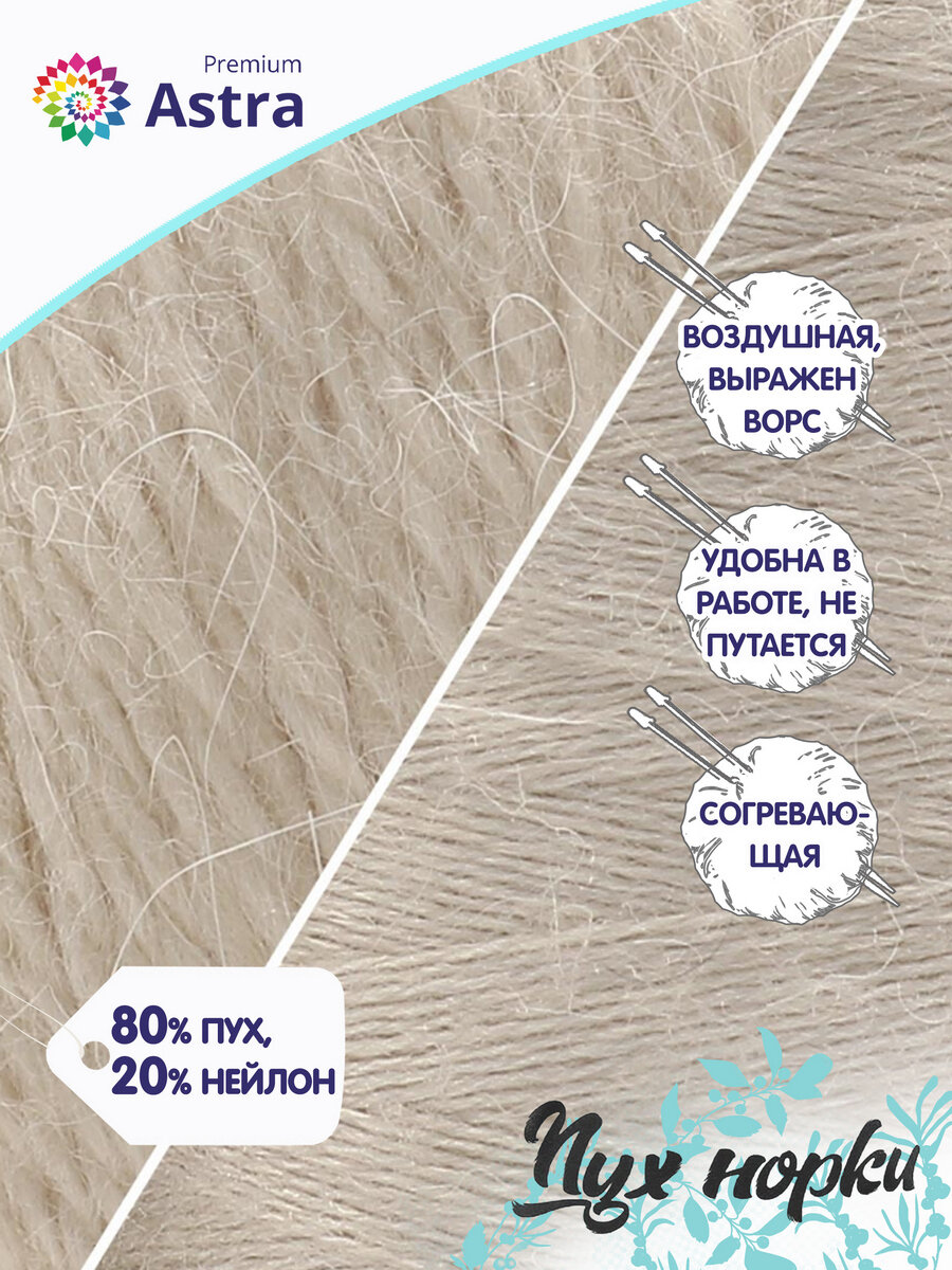 Пряжа Astra Premium "Пух норки", 50 гр 290 м, 80% пух, 20% нейлон, нить 20 гр, 065 кремовый 622 ₽