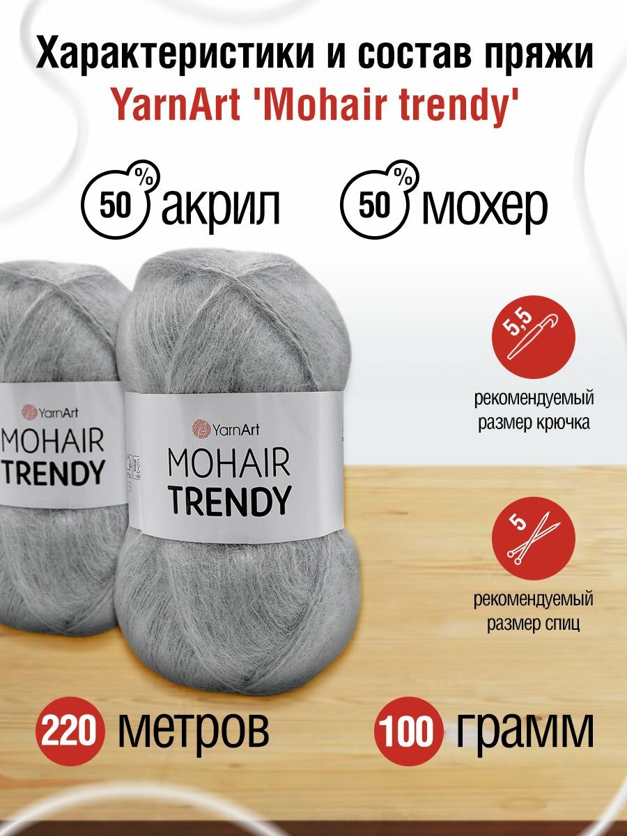 Пряжа для вязания YarnArt Mohair Trendy (ЯрнАрт Мохер Тренди) - 2 мотка 114 серый, полушерсть пушистая, 50% акрил, 50% мохер, 220м/100г