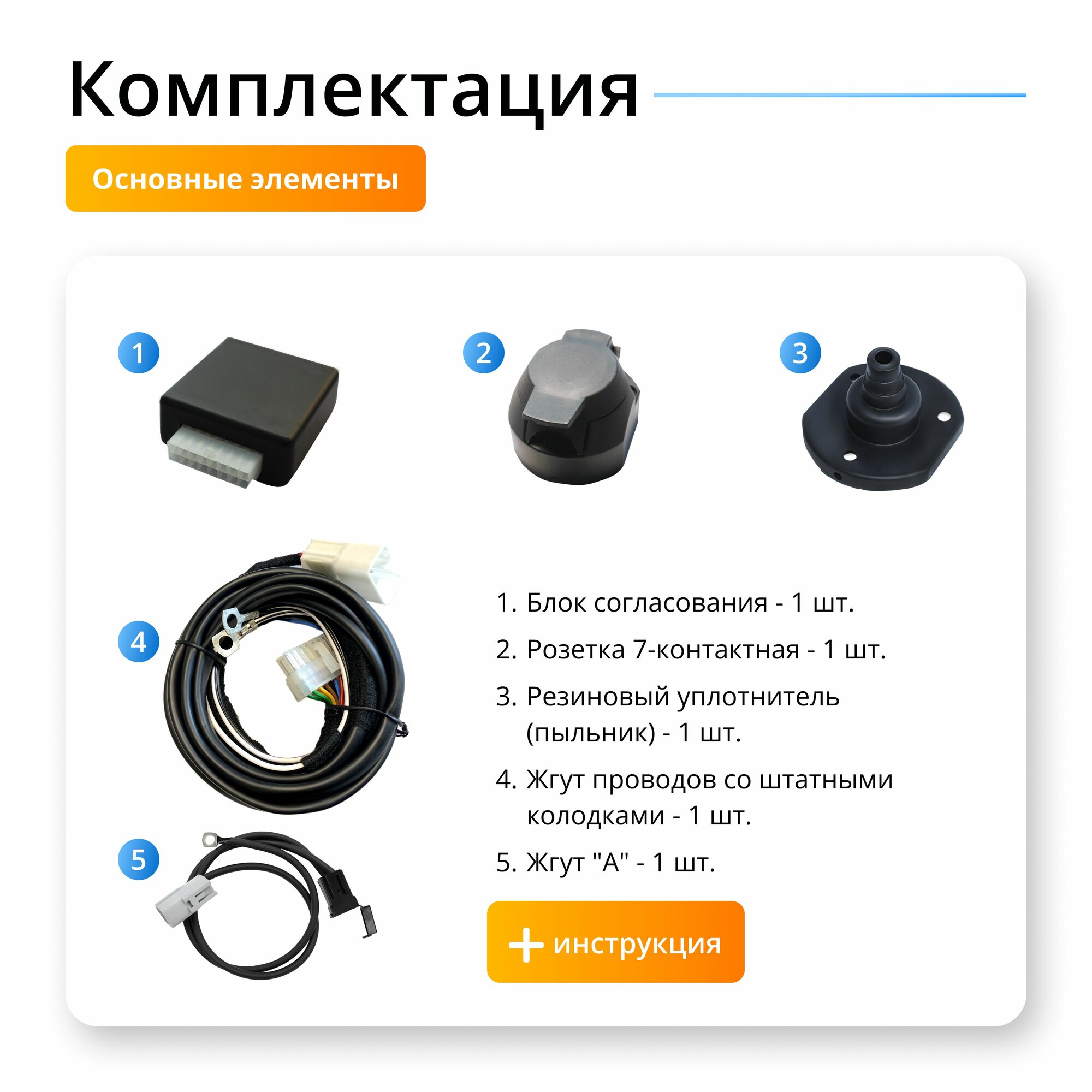 | Подробная комплектация | • Блок согласования -1шт. • Жгут проводов со штатными колодками. • Монтажный комплект -1шт. • Кабель питания-1шт. • Розетка 7-контактная с резиновым уплотнителем(пыльником)-1шт. • Инструкция -1шт. • Упаковочная коробка-1шт. |