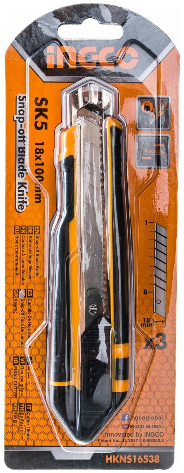 Нож канцелярский, плоский стопор, лезвие SK5 18*100мм, 169мм, 3 лезвия в комплекте, INGCO HKNS16538 информация: