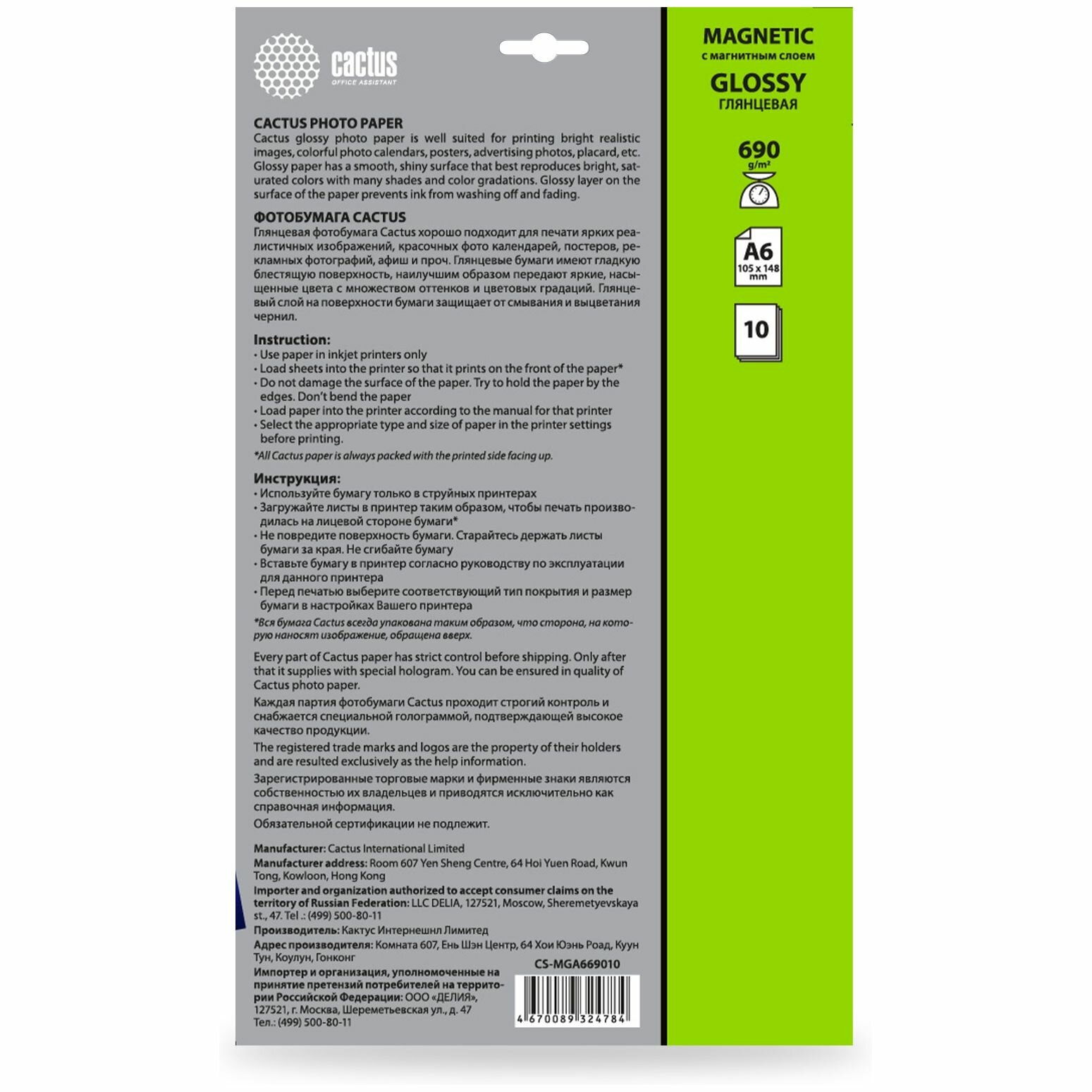 Бумага с магнитным слоем Cactus A6, 690г/м2, 10л., глянцевая, CS-MGA669010 информация: