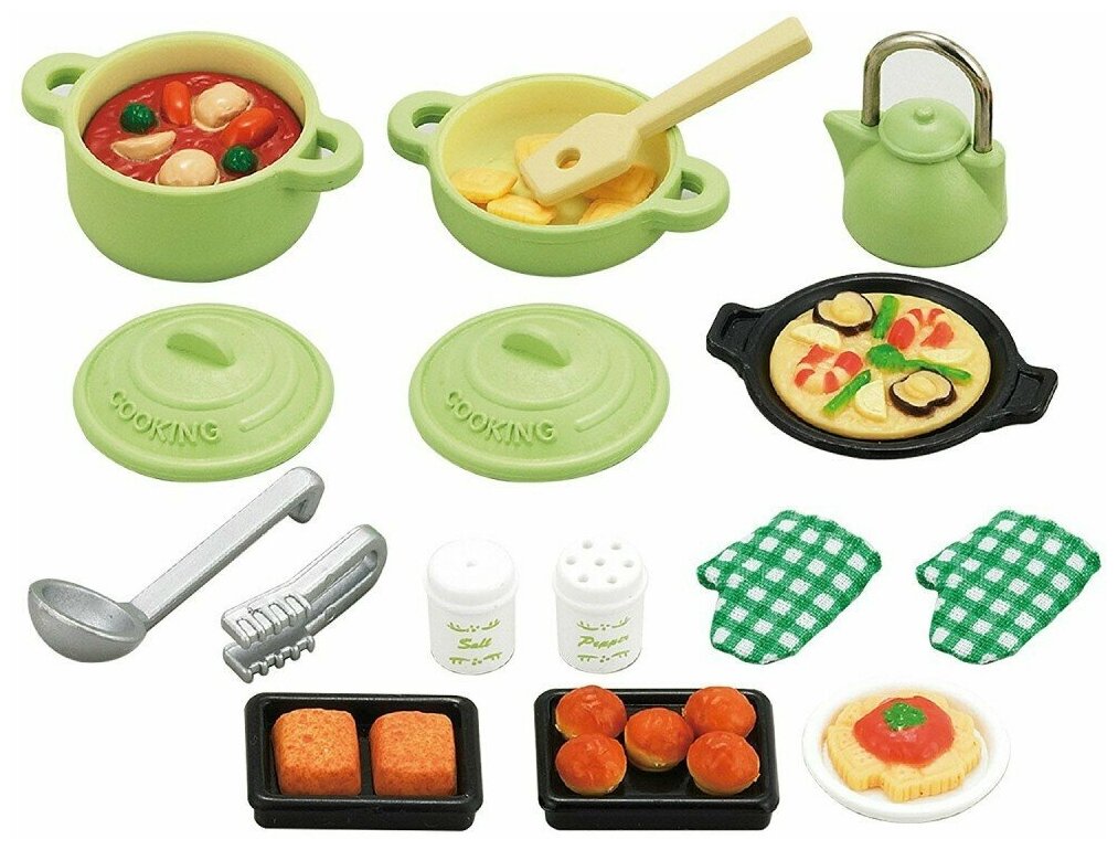 | Комплектация | 2 кастрюли к крышкам, чайник, солонка и перечница, половник, щипцы, 2 прихватки, блюдо с пиццей, тарелки с тефтелями, кексами, спагетти и др. |