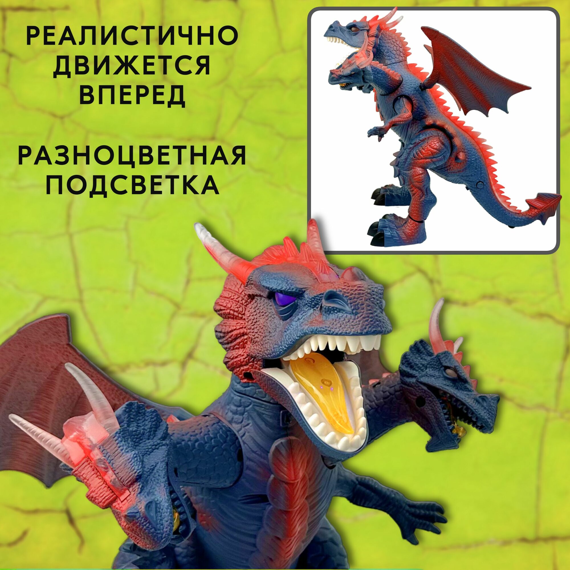 Отзывы на Интерактивная игрушка Дракон трехглавый, динозавр, сенсор, ходит, рычит, глаза, подсветка, 36х32х32см