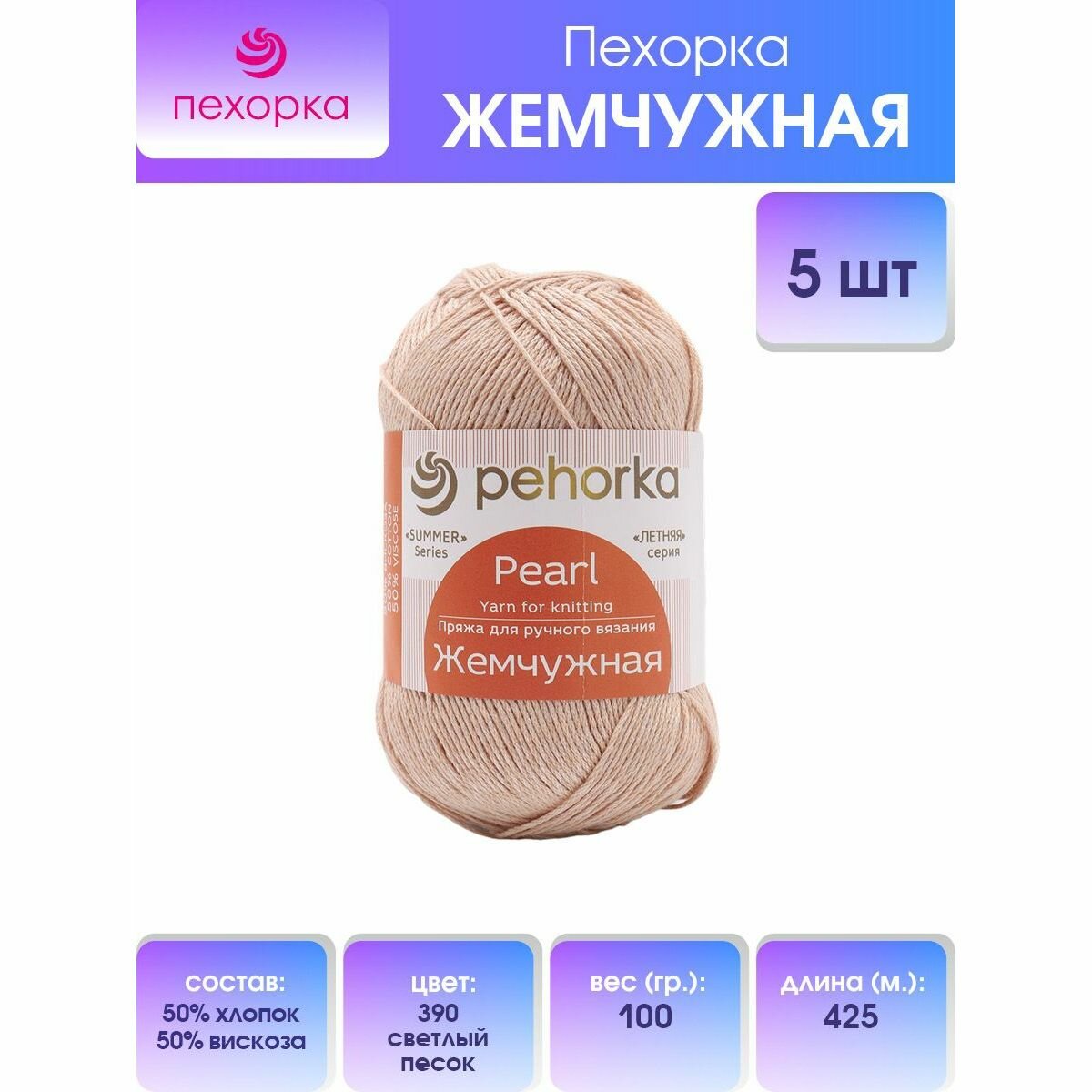 Пряжа для вязания Пехорка 'Жемчужная', 100г, 425м (50% хлопок, 50% вискоза) (390 светлый песок), 5 мотков информация: