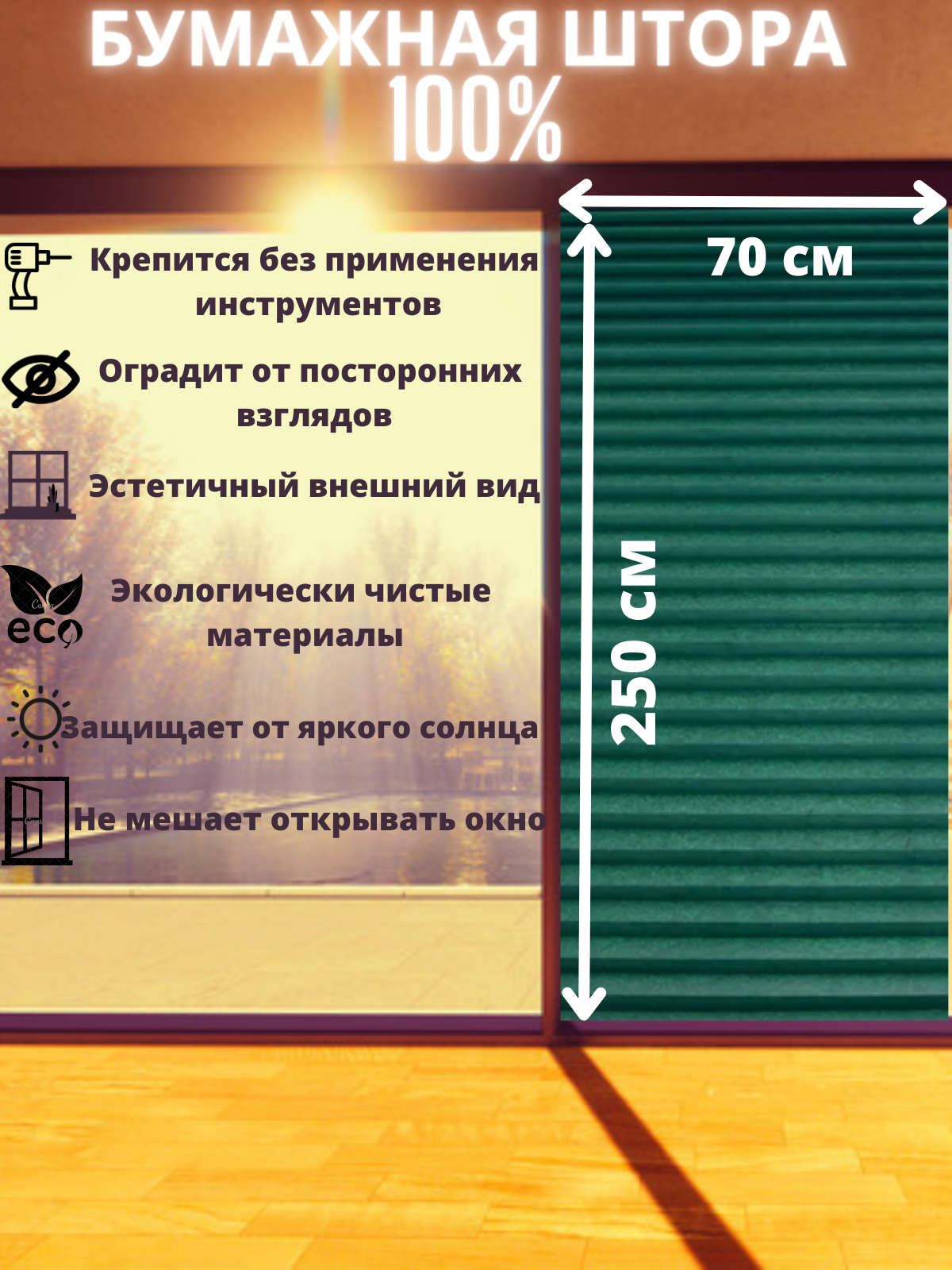 Шторы жалюзи плиссе бумажные изумрудные Rolui 70х250 см информация:
