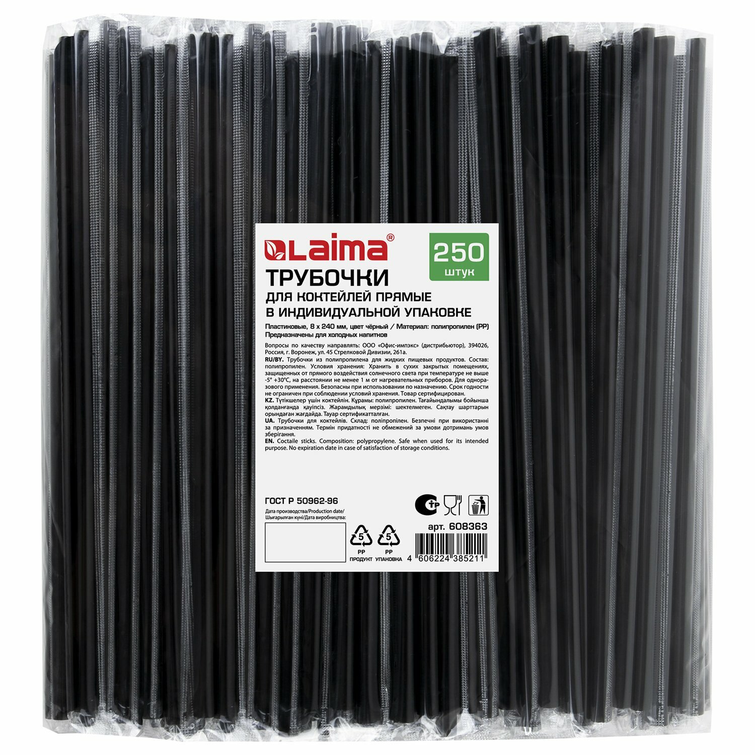 Отзывы на Одноразовые трубочки для напитков / коктейлей прямые в индивид. упаковке, 8х240 мм, черные Комплект 250 штук, Laima, 608363