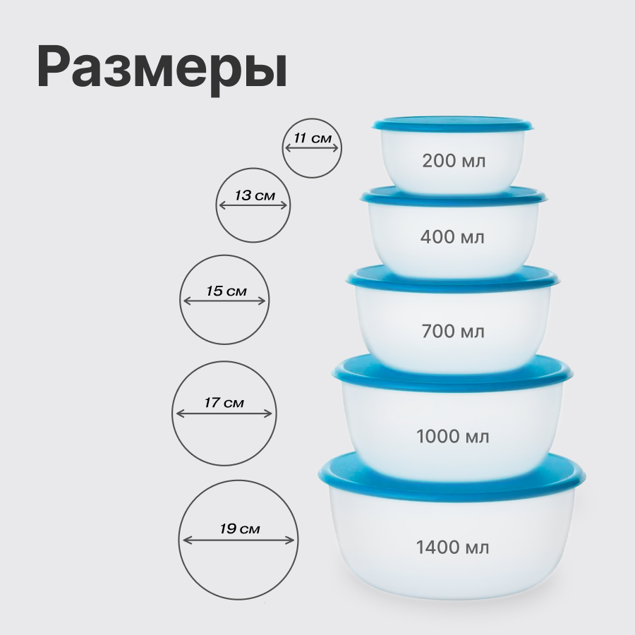 | Комплектация | Набор контейнеров для еды 5 штук: 200 мл - 1 шт., 400 мл - 1 шт., 700 мл - 1 шт., 1000 мл - 1 шт., 1400 мл - 1 шт. |