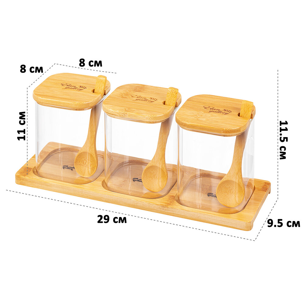| Дополнительная информация | Набор 3 банок для специй "Crystal glass" 29х9,5х11,5 см, 8х8х11 см 450 мл - каждая, высота без крышки - 10 см, на бамбуковой подставке, с бамбуковыми крышками и ложками, боросиликатное стекло |