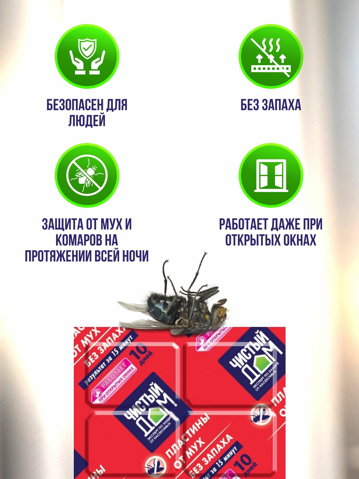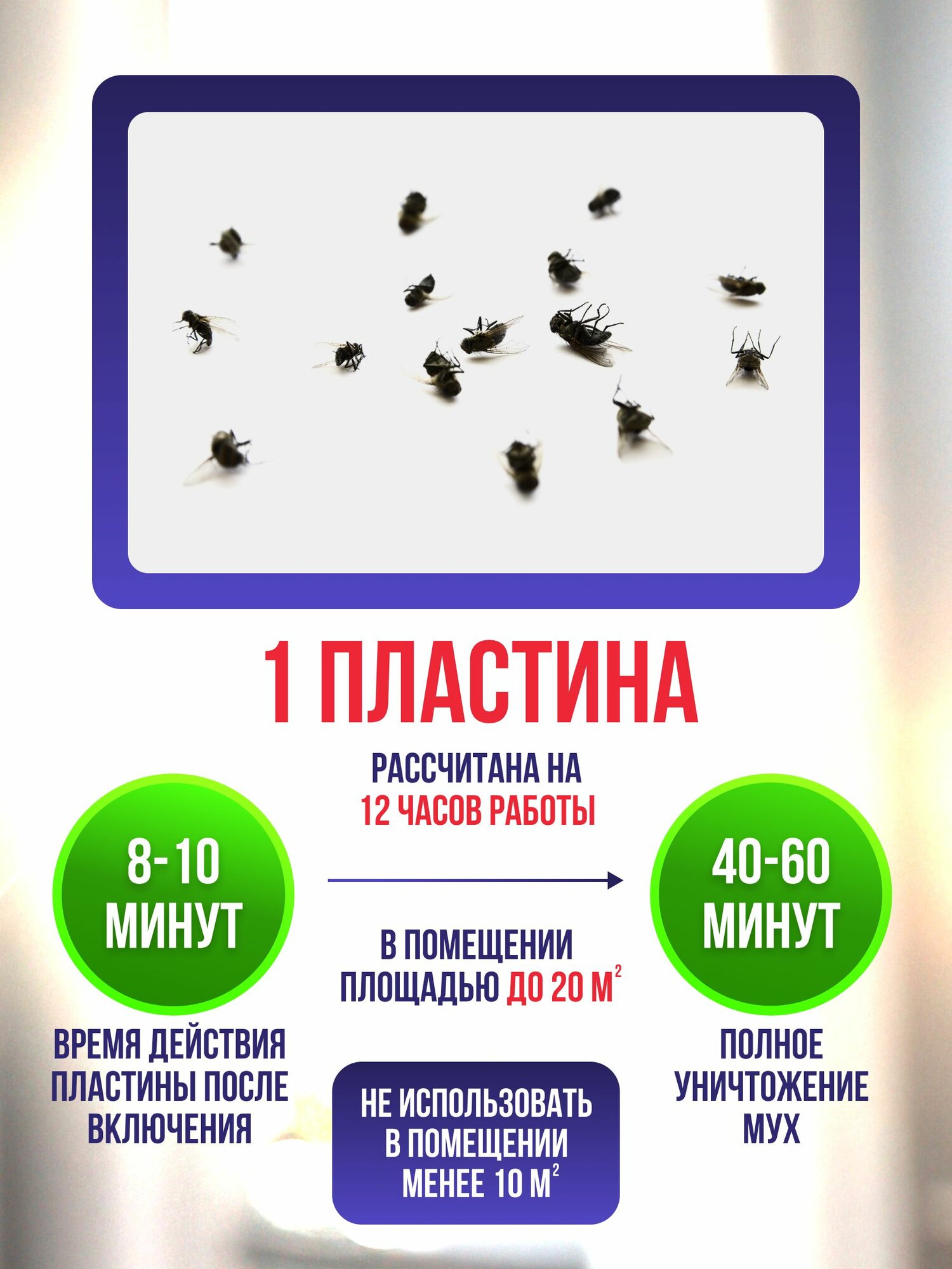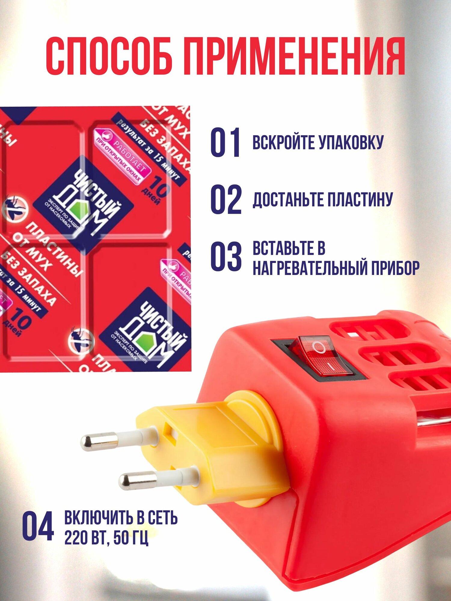 | Способ применения | вскройте упаковку, достаньте пластину от мух “Чистый Дом” и вставьте ее в нагревательный прибор; включите нагревательный прибор в электросеть (220 Вт, 50 Гц); пластина начинает действовать через 8–10 минут после включения; полное уничтожение мух достигается за 40-60 минут; наибольший эффект достигается при закрытых окнах и форточках |