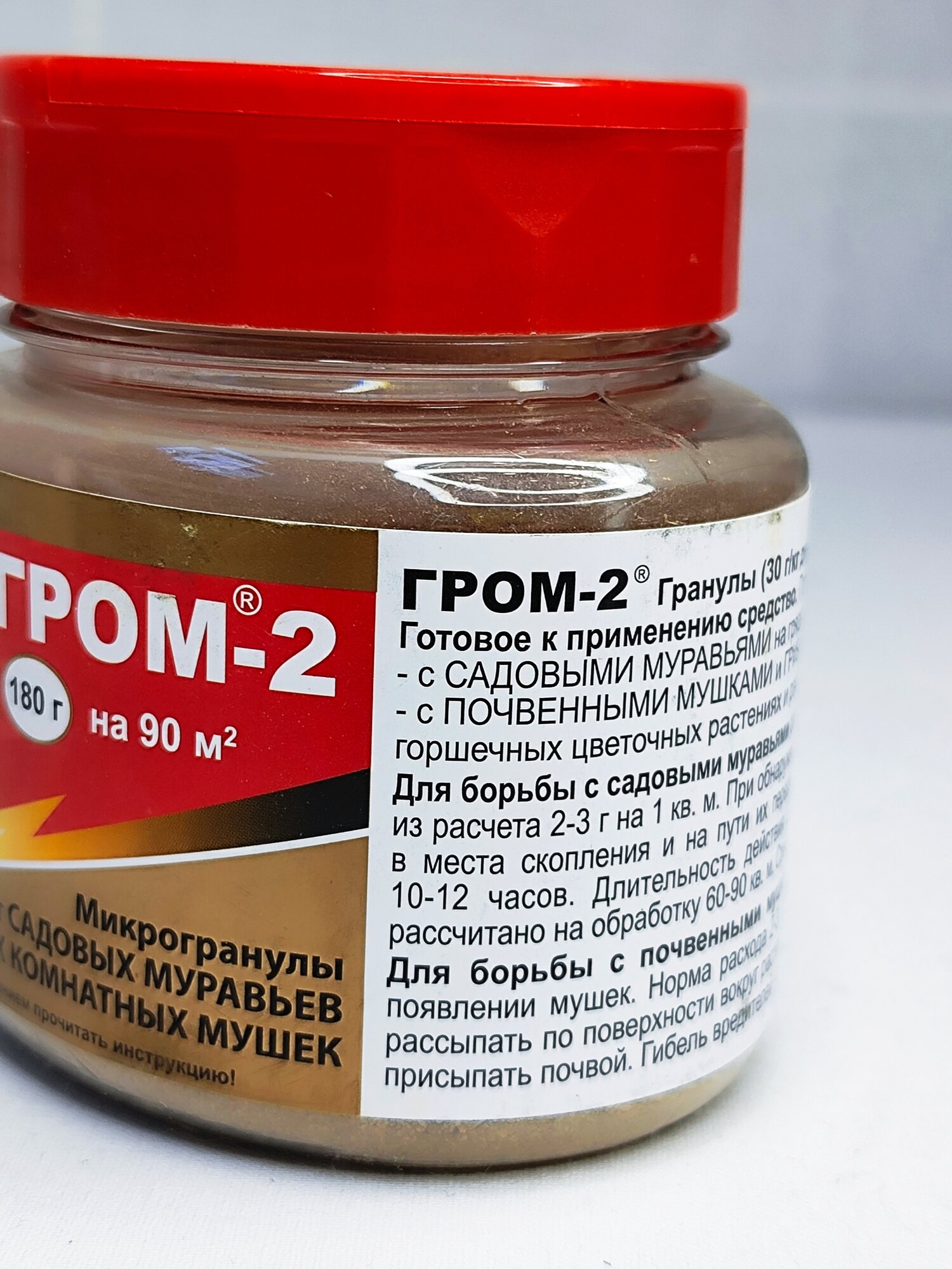 | Дополнительная информация | редство от муравьев «Гром-2» — химический инсектицид, предназначенный для истребления муравьев, почвенных мошек, грибных комаров в горшках комнатных растений и на приусадебном участке. Для достижения результатов необходимо внести препарат в толщу почвы на глубину 1–2 см по пути следования муравьев или в местах скопления насекомых. Муравьи гибнут спустя 3–5 дней после контакта с действующим веществом препарата. Защитное действие сохраняется 2–3 месяца, достаточно купить препарат 1–2 раза на сезон. Упаковки в 10 г хватает для обработки 8–10 м2 почвы. |