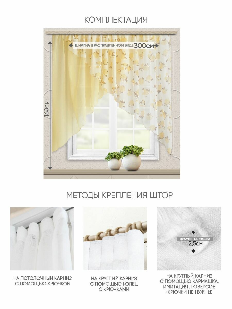 | Комплектация | Комплект состоит из 2-х элементов, сшитых на одной шторной ленте. Каждое полотно имеет скошенный край, удлинение на правую и левую сторону по внешним краям, при соединении они и образуют своеобразную арку с острым углом. Размер комплекта: Ширина 280 см, высота по самому длинному краю 160 см, высота арки 50 см (+/- 2 см). К шторе пришита шторная лента шириной 2 см, крепление за крючки. |