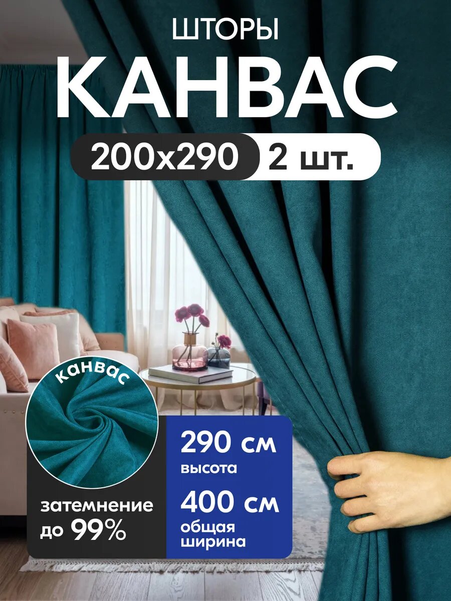 Комплект матовых портьерных штор 400x290 см, 2 штуки, канвас, цвет: бирюзовый 3 700 ₽