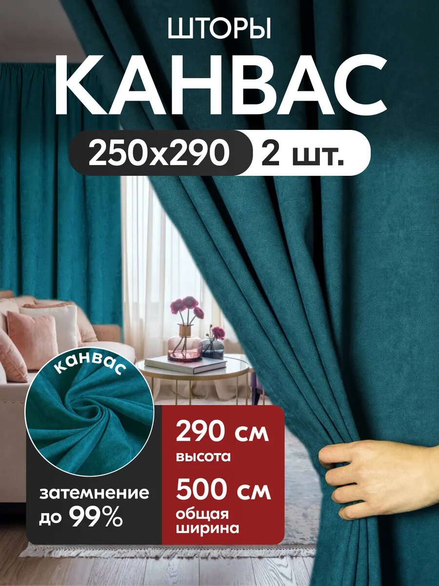 Комплект матовых портьерных штор 500x290 см, 2 штуки, канвас, цвет: бирюзовый 4 500 ₽