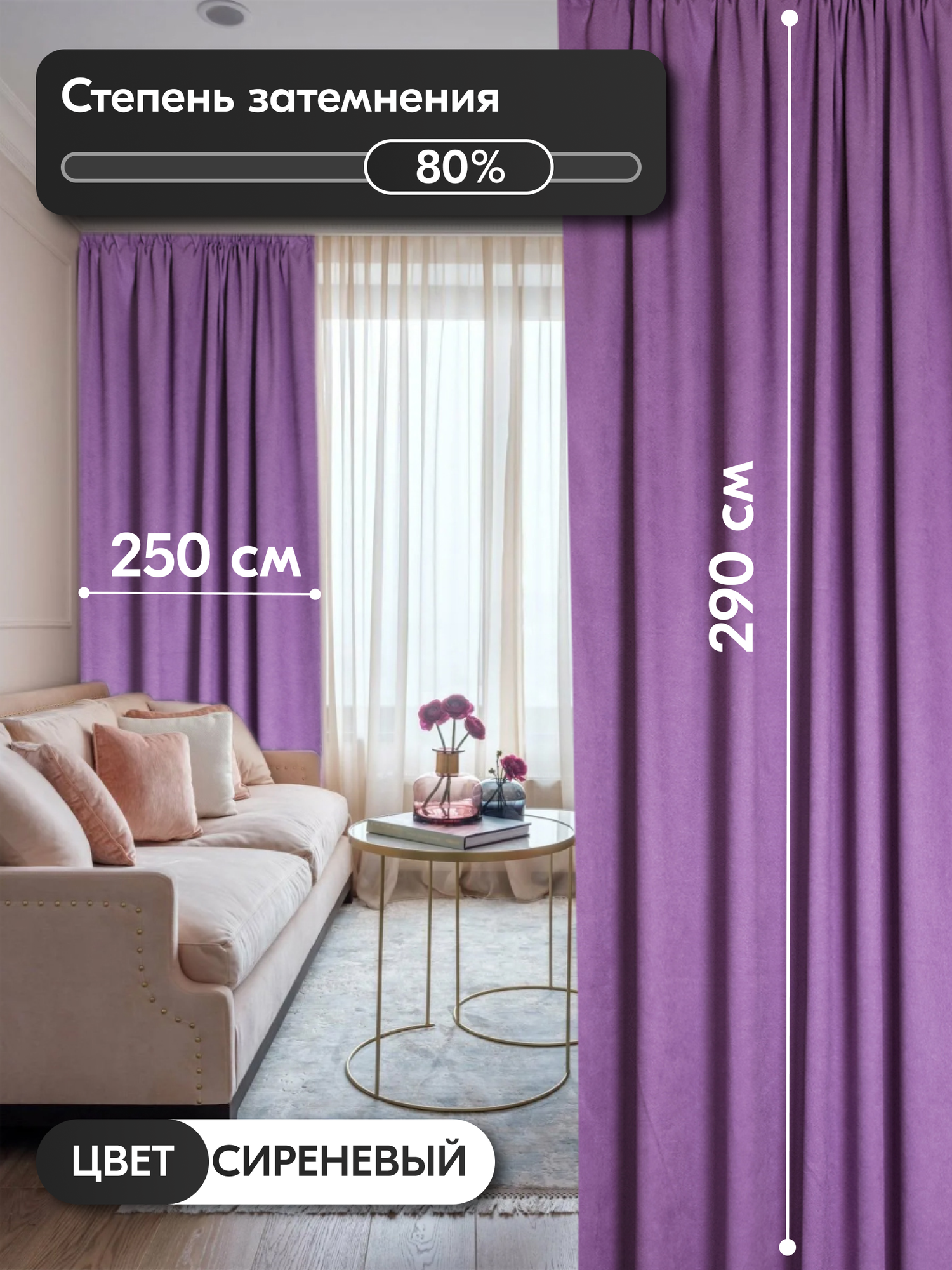 Комплект матовых портьерных штор 500x290 см, 2 штуки, канвас, цвет: сиреневый информация: