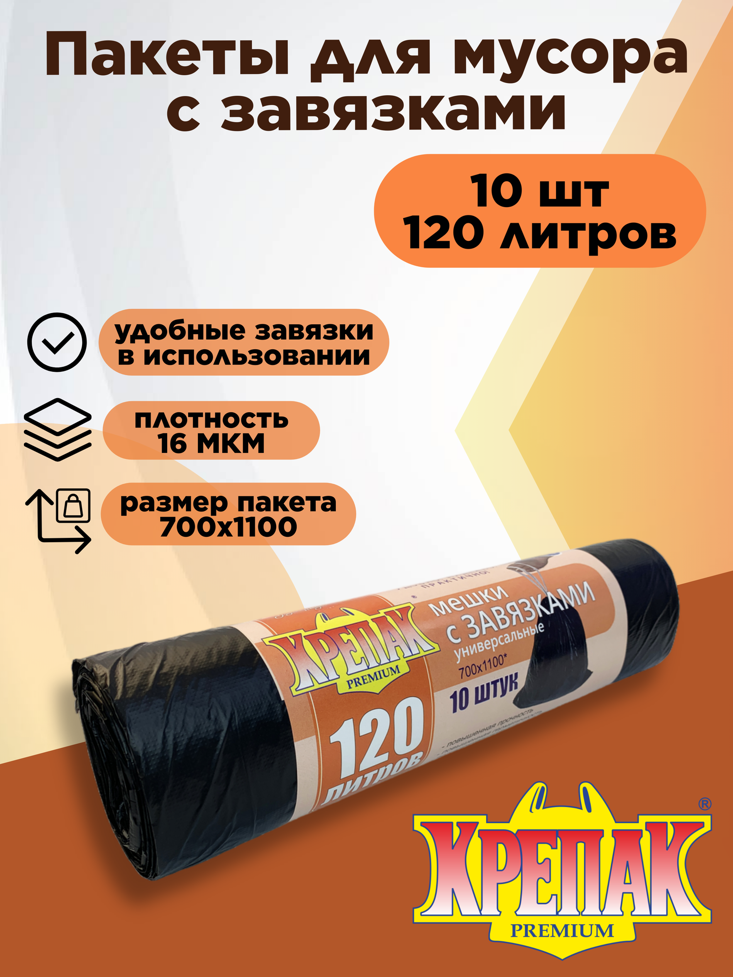 Мешки для мусора с завязками в рулоне Крепак 120 л, 10 шт информация: