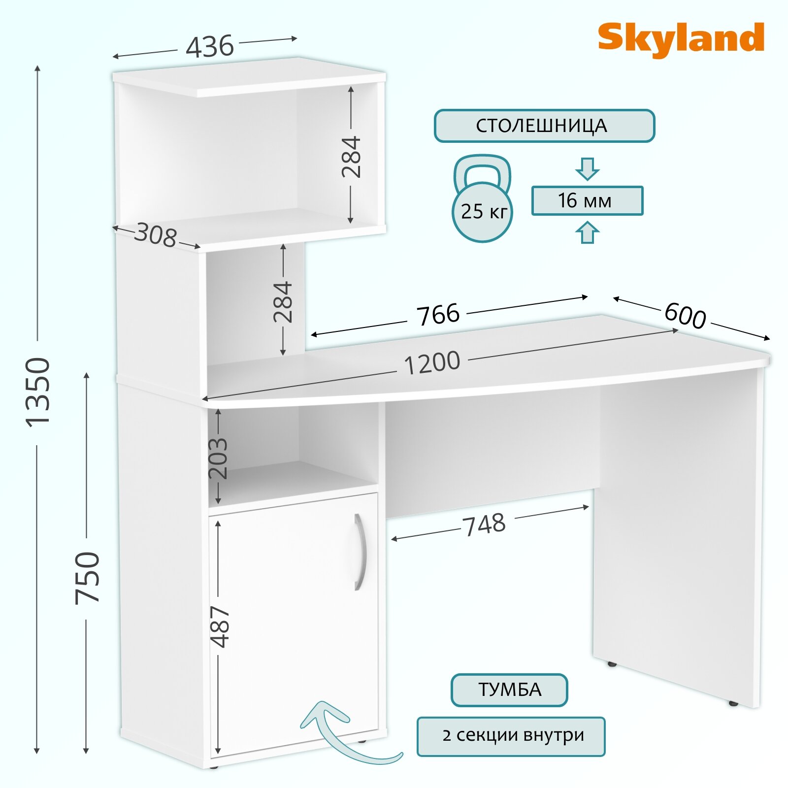 Компьютерный стол с полками и тумбой / письменный стол-стеллаж SKYLAND COMP CD 1213, белый, 120х60х135 см информация: