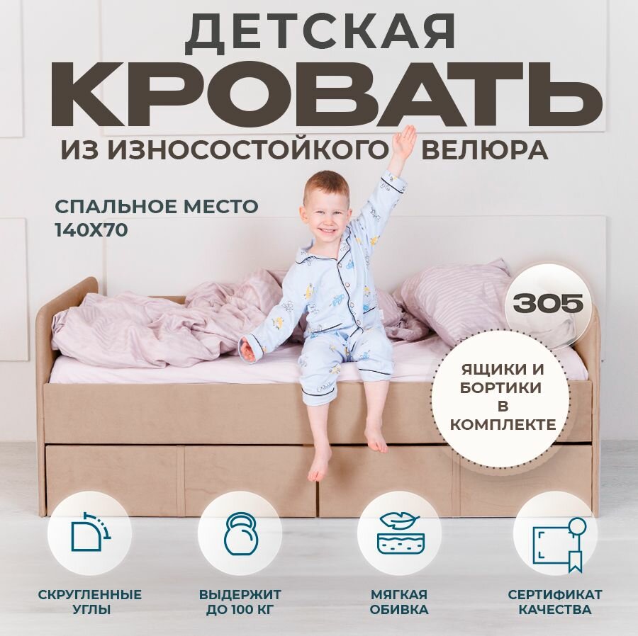 Кровать детская подростковая односпальная 140х70 бежевый с двумя ящиками и бортиком в комплекте информация: