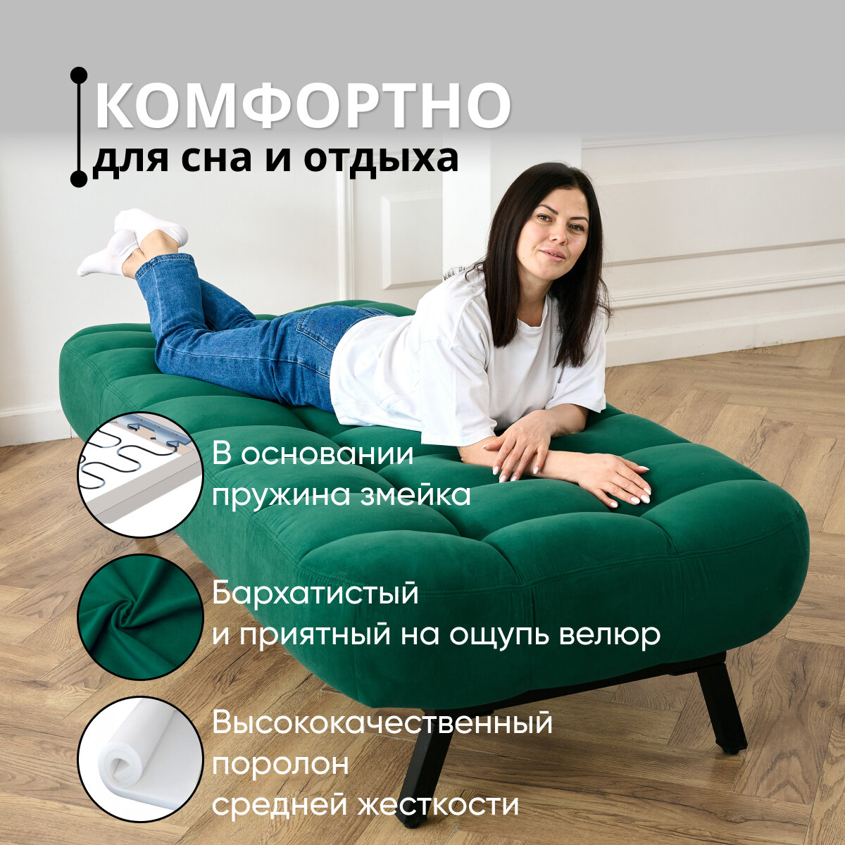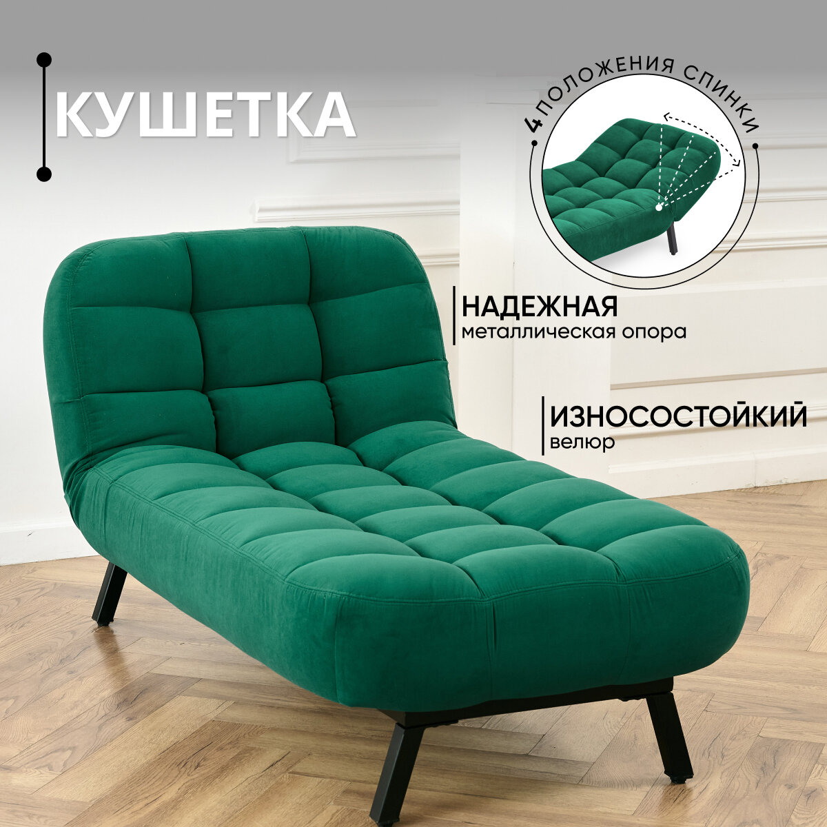Отзывы на Кушетка оттоманка Brendoss 310 лофт раскладная регулируемая клик-кляк на металлокаркасе материал износостойкий велюр, цвет изумрудный