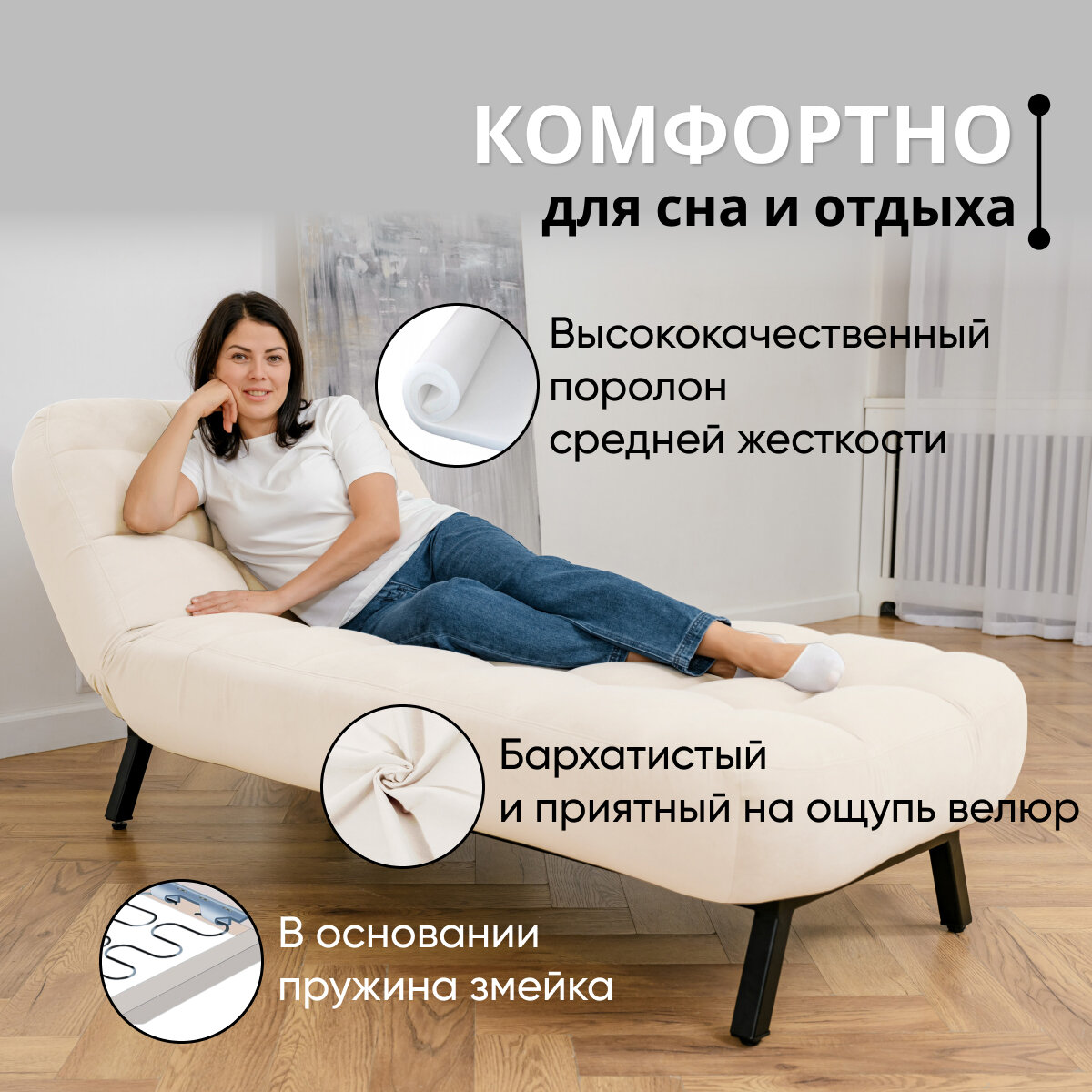 Отзывы на Кушетка оттоманка Brendoss 310 лофт раскладная регулируемая клик-кляк на металлокаркасе материал износостойкий велюр, цвет молочный