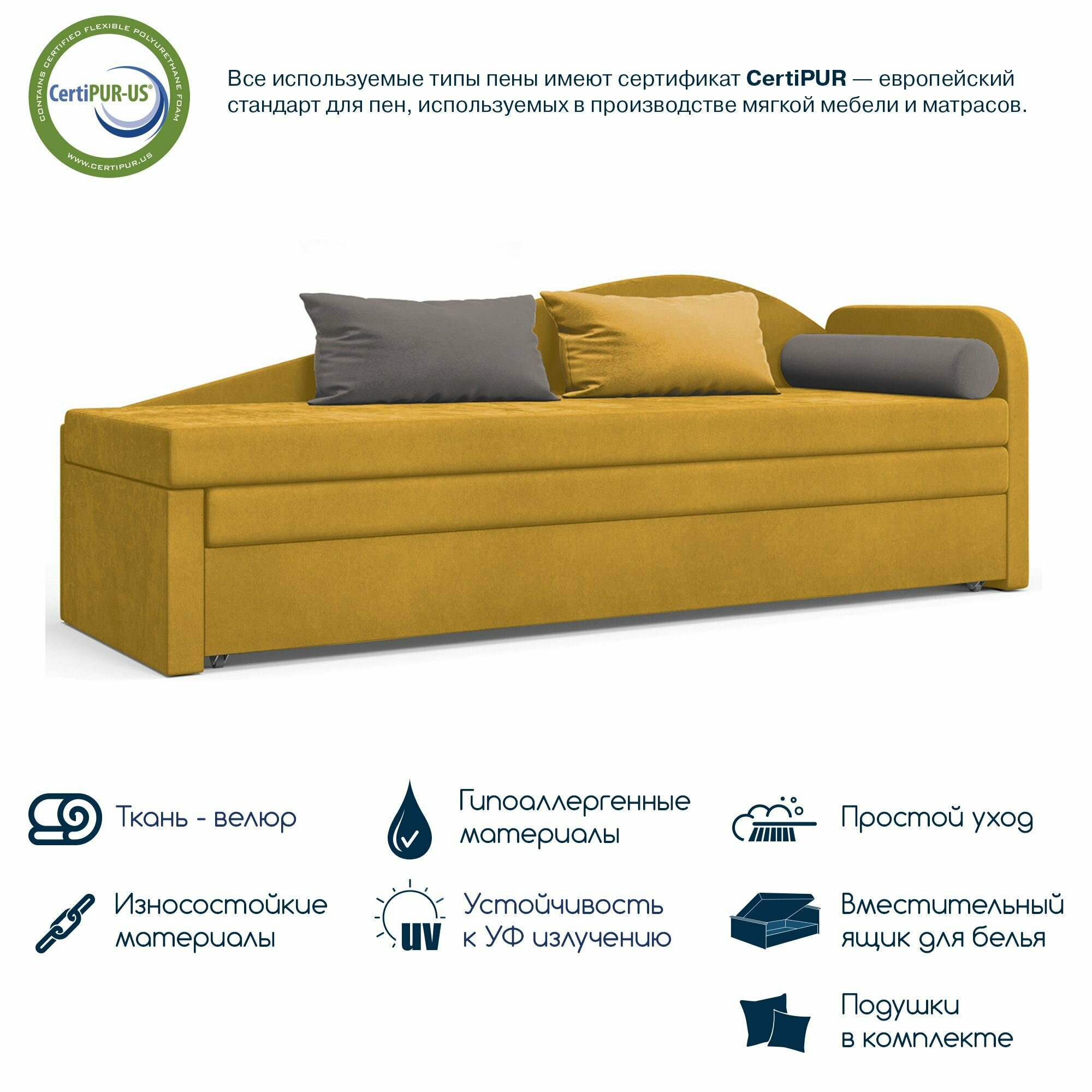 Диван-кровать, кушетка, прямой диван Beneli арчи (правый), раскладной, с ящиком для хранения, жёлтый, Велюр, механизм Выкатной, 200х68х80см, 1шт информация: